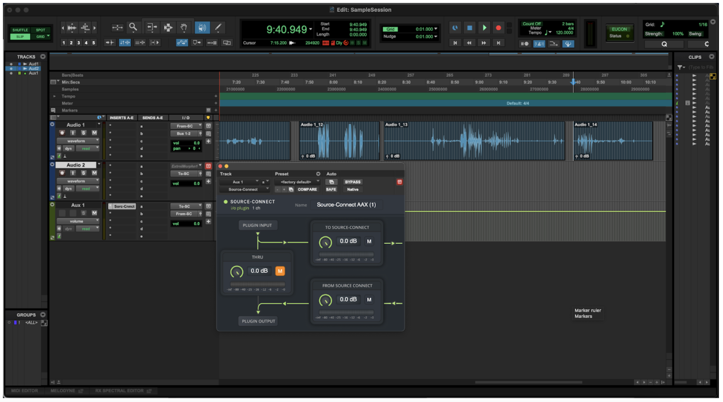 Dentro de tu DAW, puedes enviar cualquier audio a la pista auxiliar que quieras enviar a Source-Connect. Esto podría incluir, por ejemplo, tu micrófono de intercomunicación, música o cualquier otro audio, según tus necesidades. La salida de esa pista auxiliar contendrá el audio que regresa de Source-Connect, así que puedes usar un bus para llevarlo a una pista de grabación (o a lo que necesites).