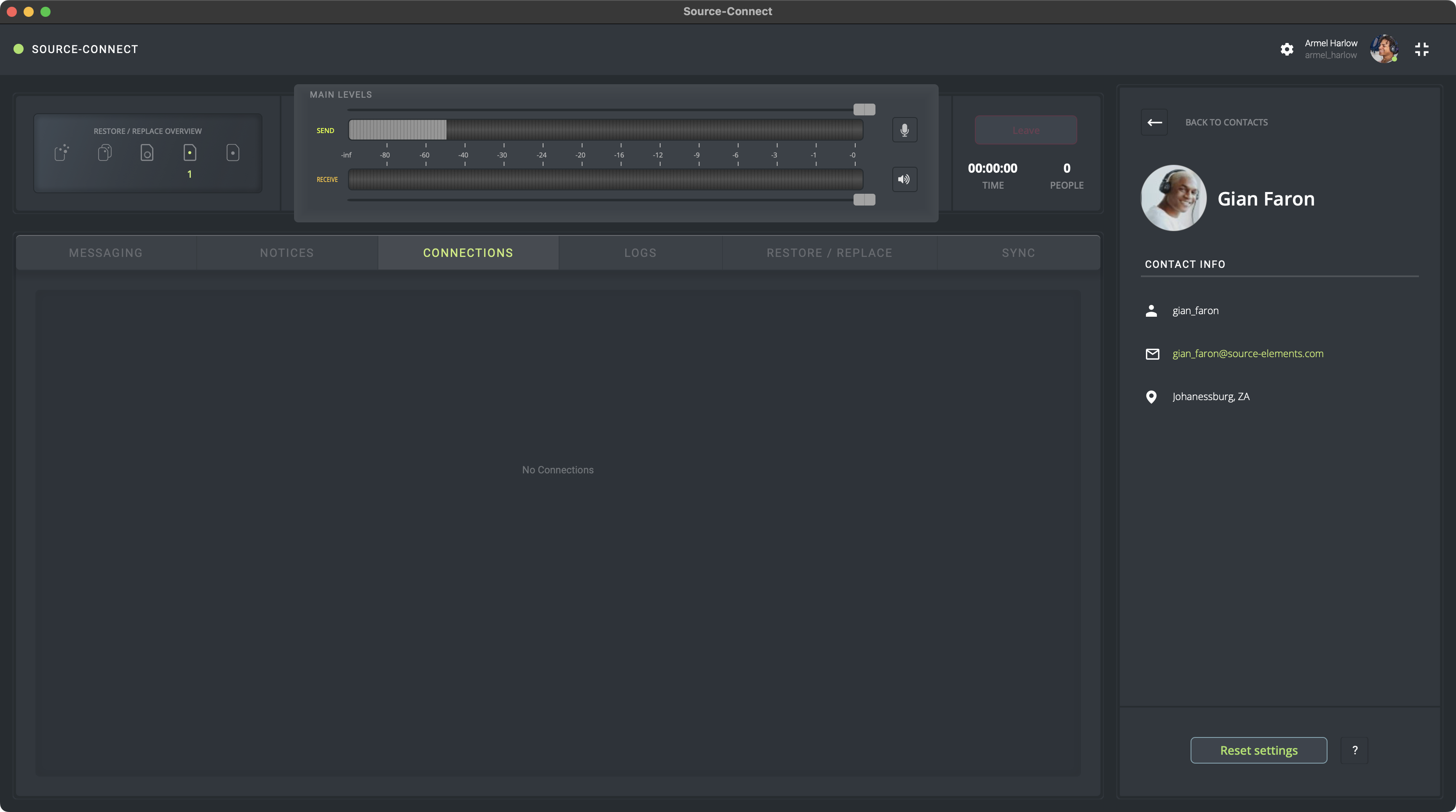 Con Source-Connect 4 Studio/Facility, si ha configurado ajustes específicos para uno de sus contactos, puede restablecer los ajustes predeterminados antes de iniciar su llamada haciendo clic en la tarjeta del contacto y haciendo clic en "Restablecer configuración" en la parte inferior. esquina derecha.