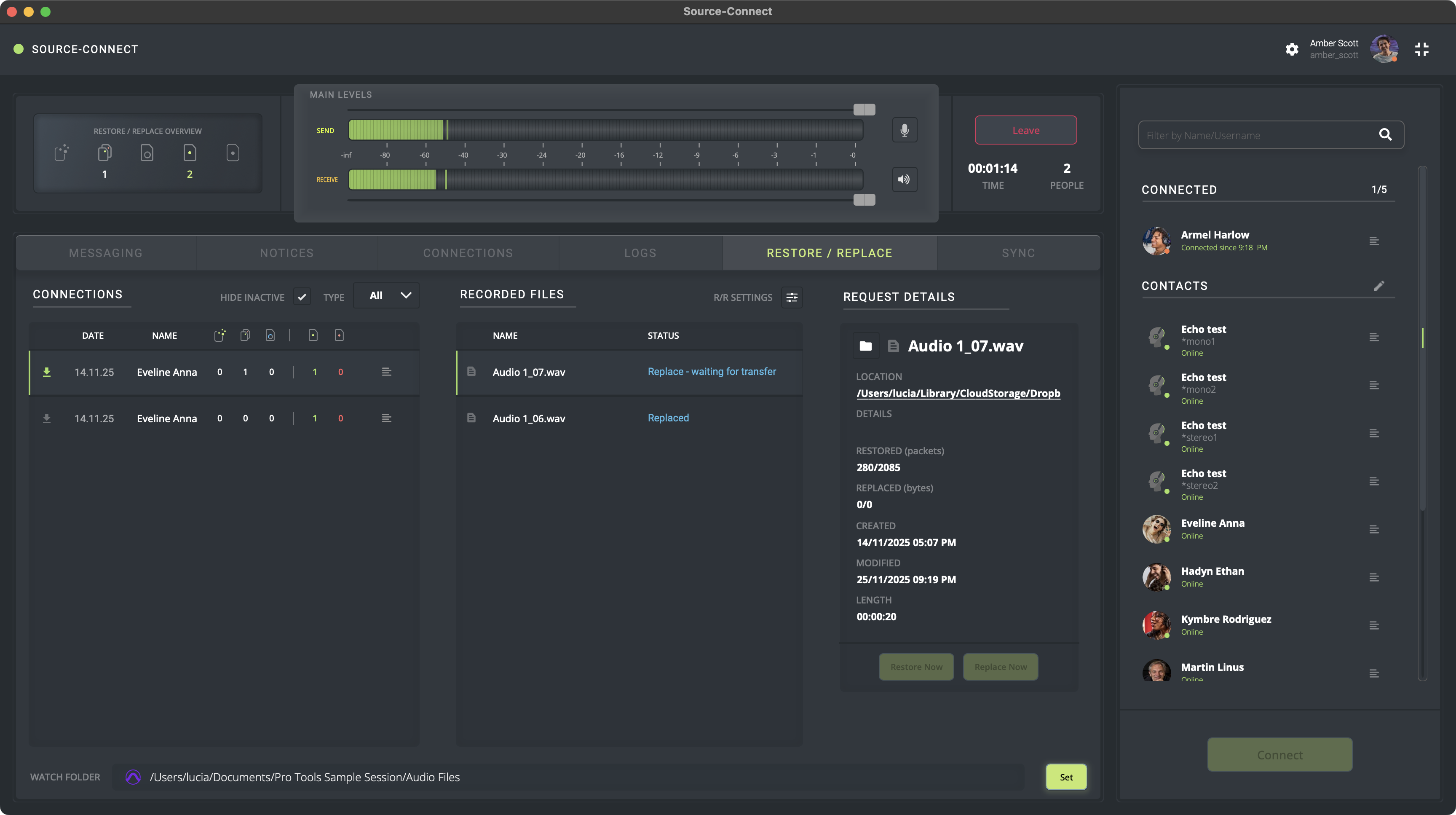 - Restaurar/Reemplazar no presente: los archivos de audio no se grabaron con Source-Connect o hubo un error con su enrutamiento. Consulte la documentación de soporte para obtener más detalles sobre enrutamiento y grabación y una lista de verificación paso a paso con Source-Connect.