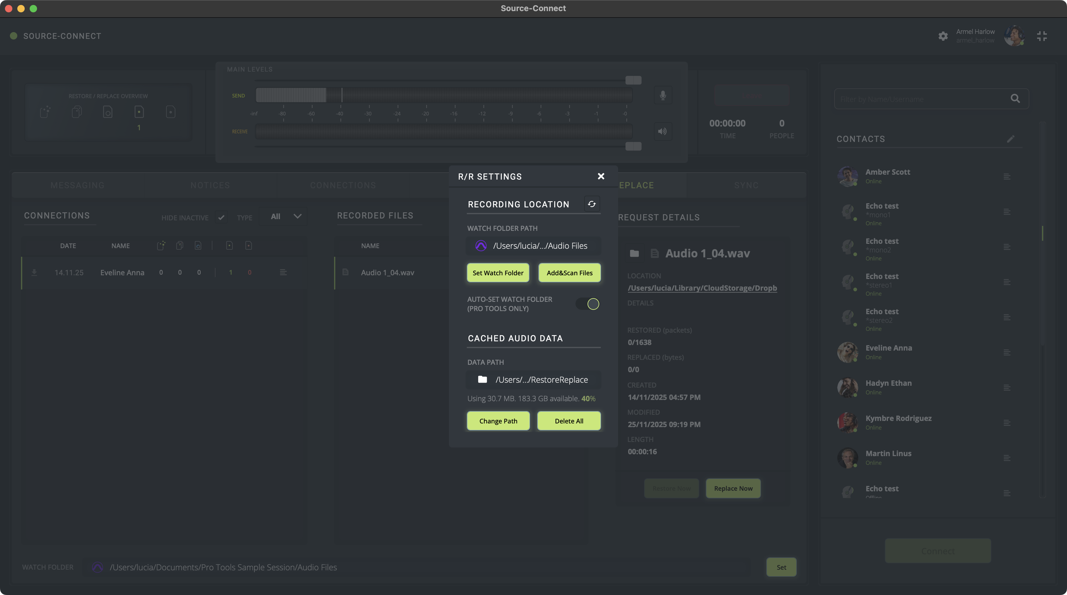 - Panel de restauración/reemplazo: archivos grabados en Source-Connect Studio/Facility