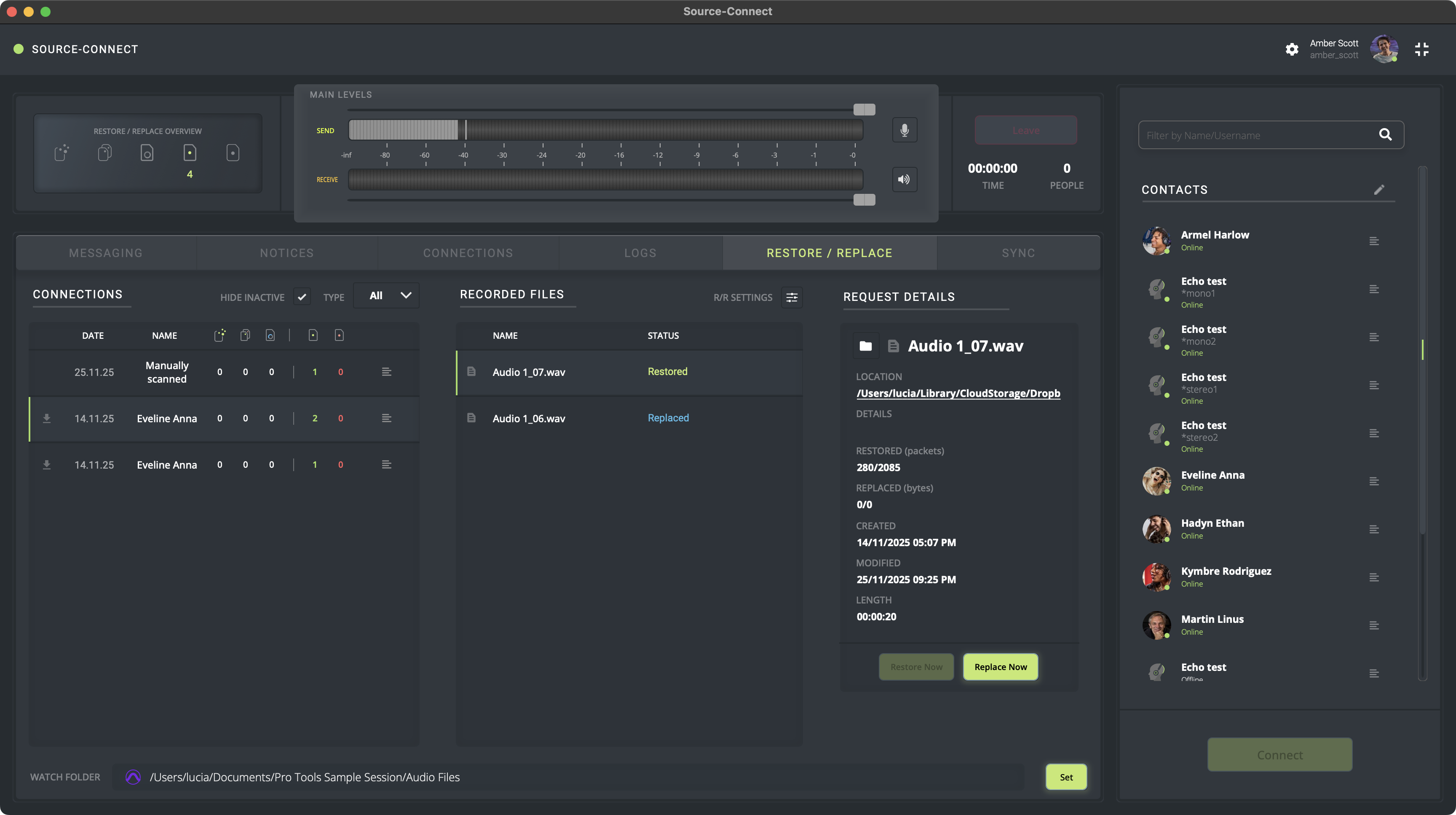 - Restaurar/Reemplazar panel: Cargar o solicitar detalles en Source-Connect Studio/Facility