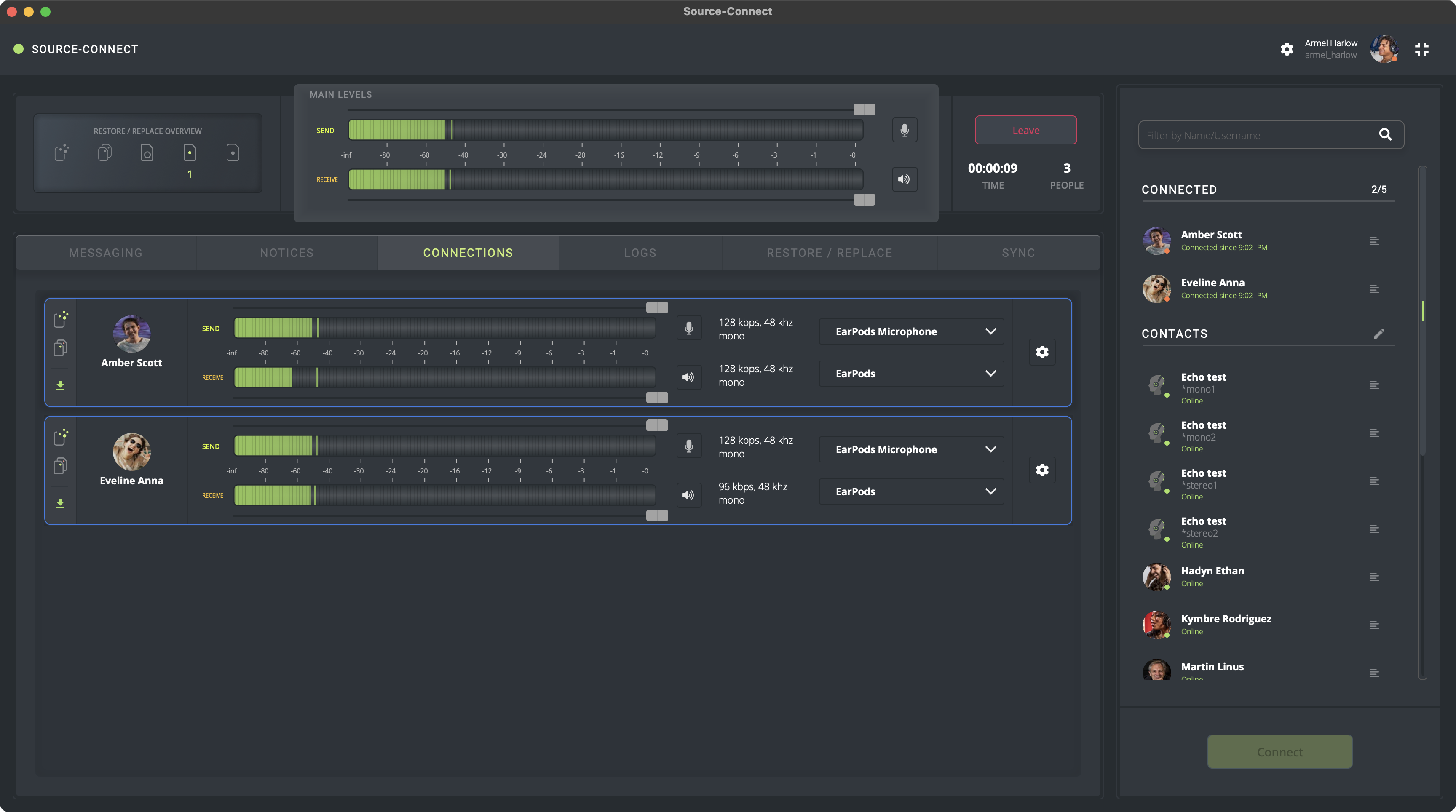 Para establecer una conexión, seleccione los usuarios que desea agregar en el panel "Contactos" (la tarjeta de contacto mostrará un marcador verde en el borde izquierdo), seleccione las preferencias Restaurar/Reemplazar para la sesión y haga clic en "Conectar". ;