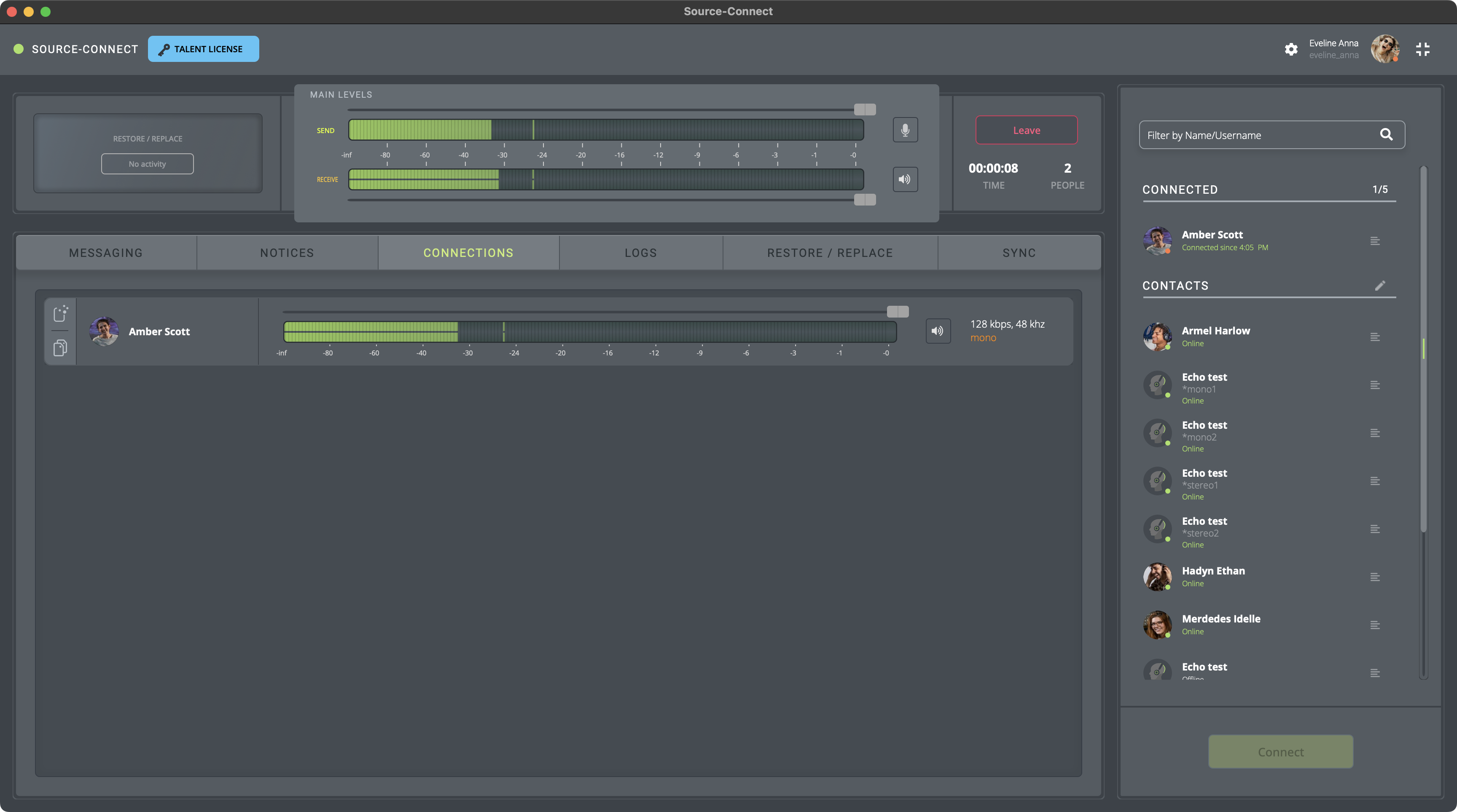 La pestaña CONEXIONES en Source-Connect muestra la lista de participantes con los que está conectado durante una sesión, además de las siguientes propiedades para cada uno de ellos: