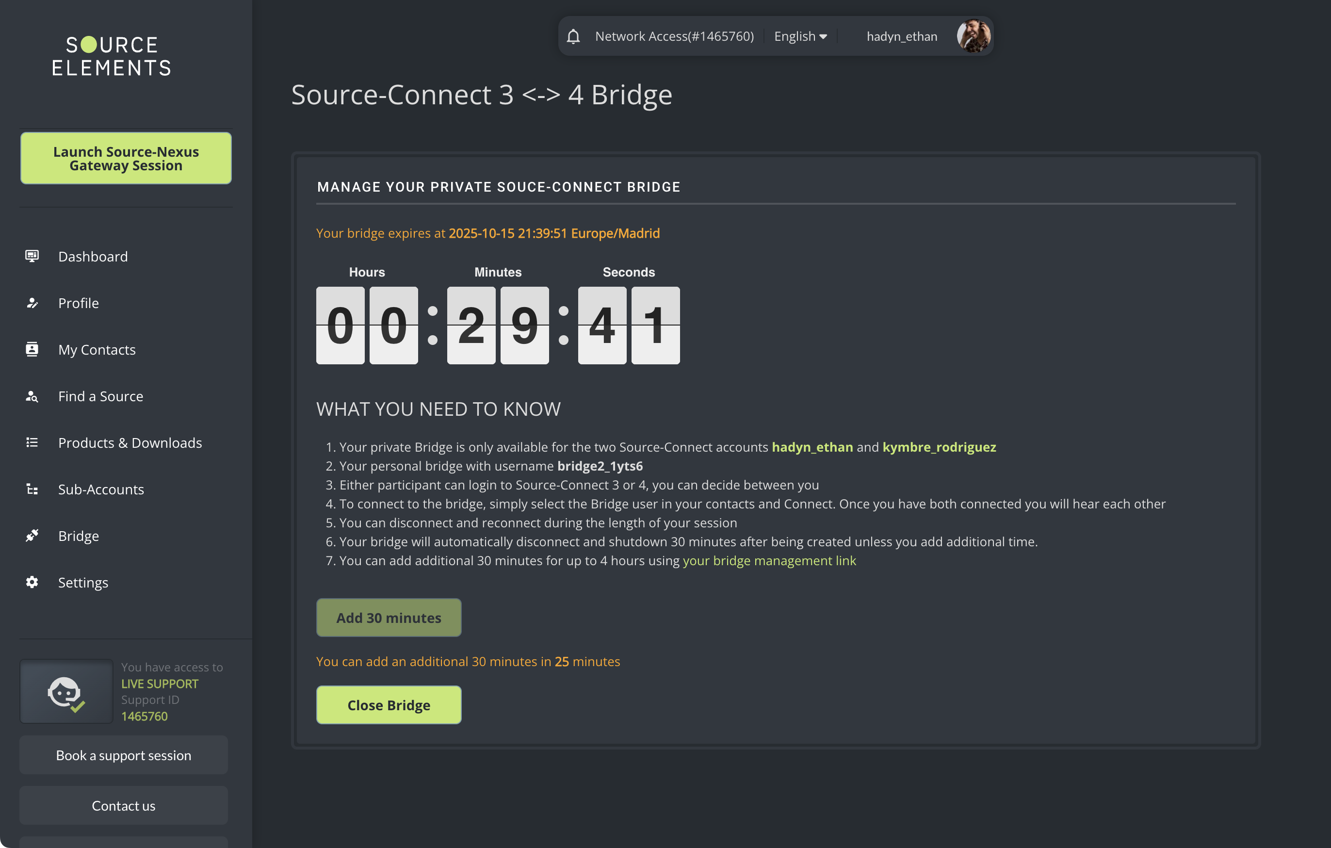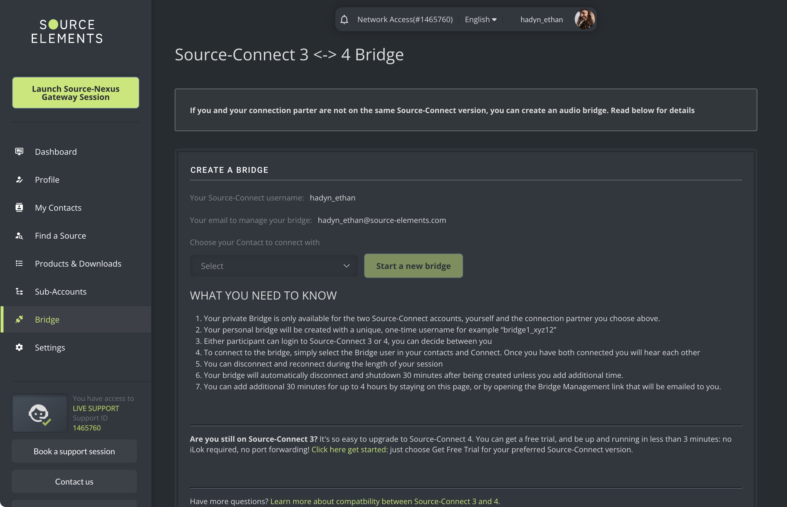 Tanto usted como el usuario de Source-Connect 3 necesitarán conectarse a su puente personal (al que se le asignará un nombre).