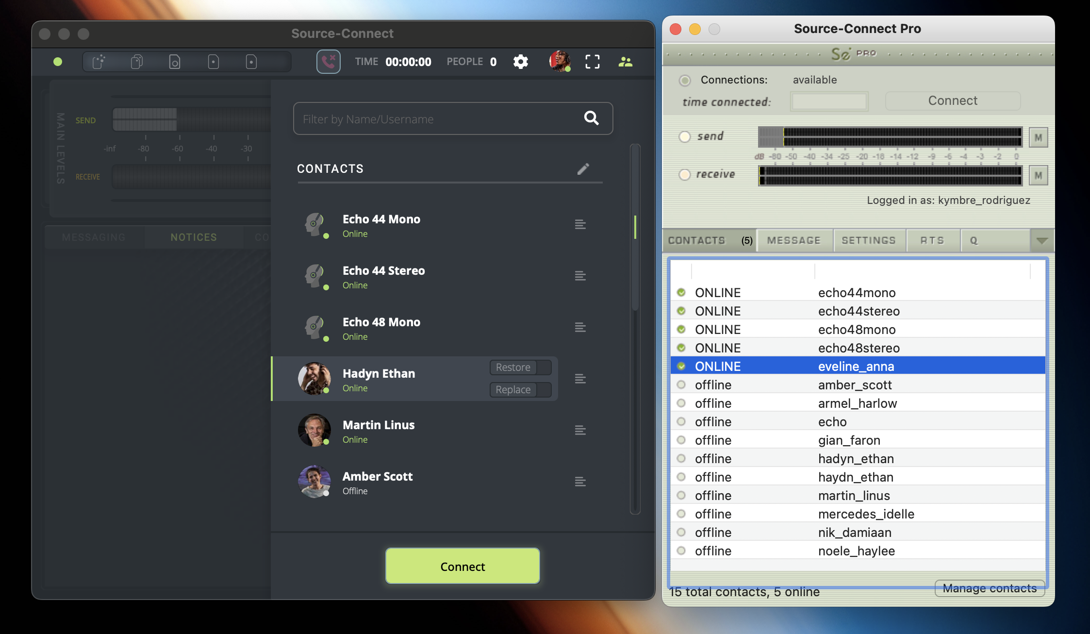 Sin embargo, puedes ejecutar Source-Connect 4 y Source-Connect 3 en la misma computadora muy felizmente. A continuación, en esta imagen, puede ver que Kymbre ha iniciado sesión en Source-Connect 3 y Source-Connect 4 al mismo tiempo. Sus contactos Hadyn y Martin están conectados a Source-Connect 4, mientras que su contacto Eveline Anna está conectada a Source-Connect 3. Kymbre podría conectarse a todos sus contactos al mismo tiempo si quisiera, y Hadyn y Martin podrían hablar con Eveline Anna si Kymbre creara una ruta de audio entre ellos.