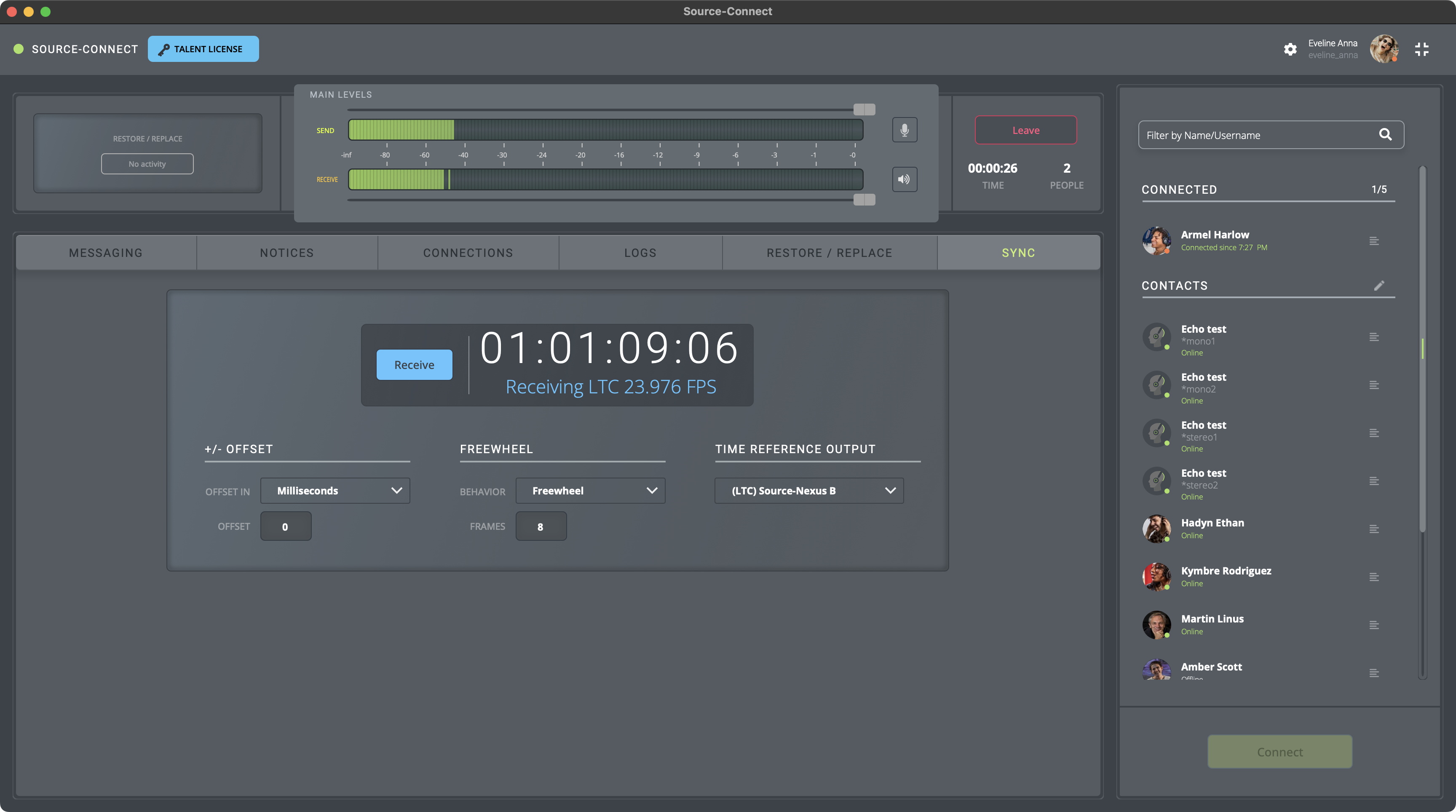 - El panel de SYNC en Source-Connect Talent