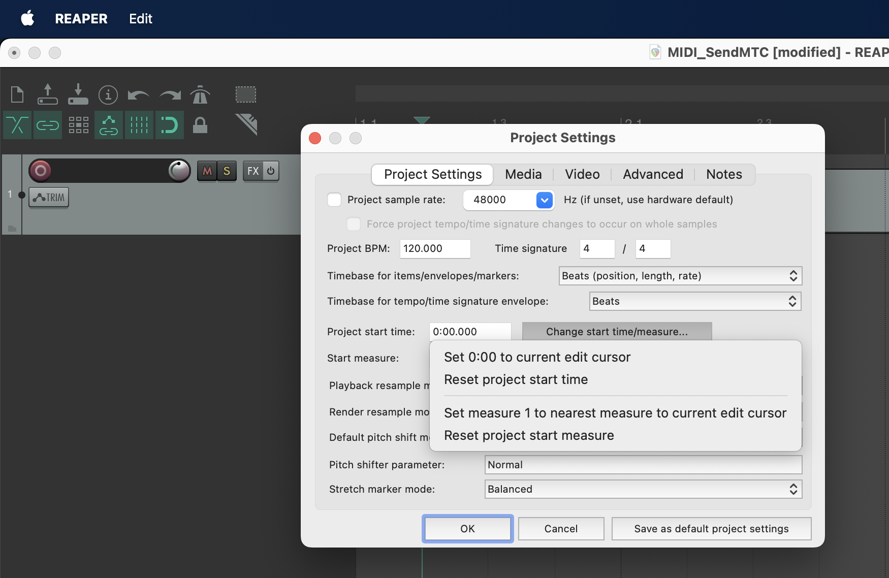 - En Reaper, ve a Archivo > Configuración del proyecto > pestaña Configuración del proyecto y asegúrese de que la hora de inicio del proyecto sea correcta. Además, vaya a la pestaña Vídeo y asegúrese de que la velocidad de fotogramas sea correcta.