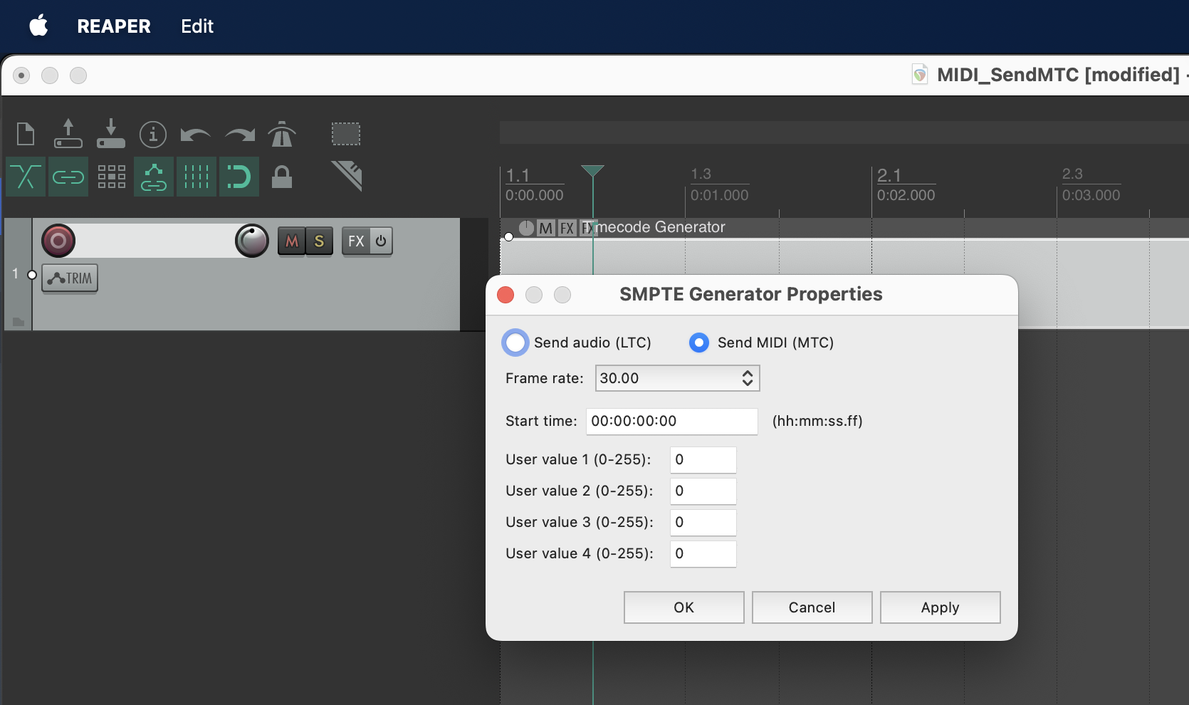 - En Reaper, ve a Insertar > Generador de código de tiempo SMPTE LTC/MTC. Luego, haga doble clic en el generador para acceder a las Propiedades del generador SMPTE. Allí, haga clic en "Enviar MIDI (MTC)" y establezca la velocidad de fotogramas y los tiempos de inicio: