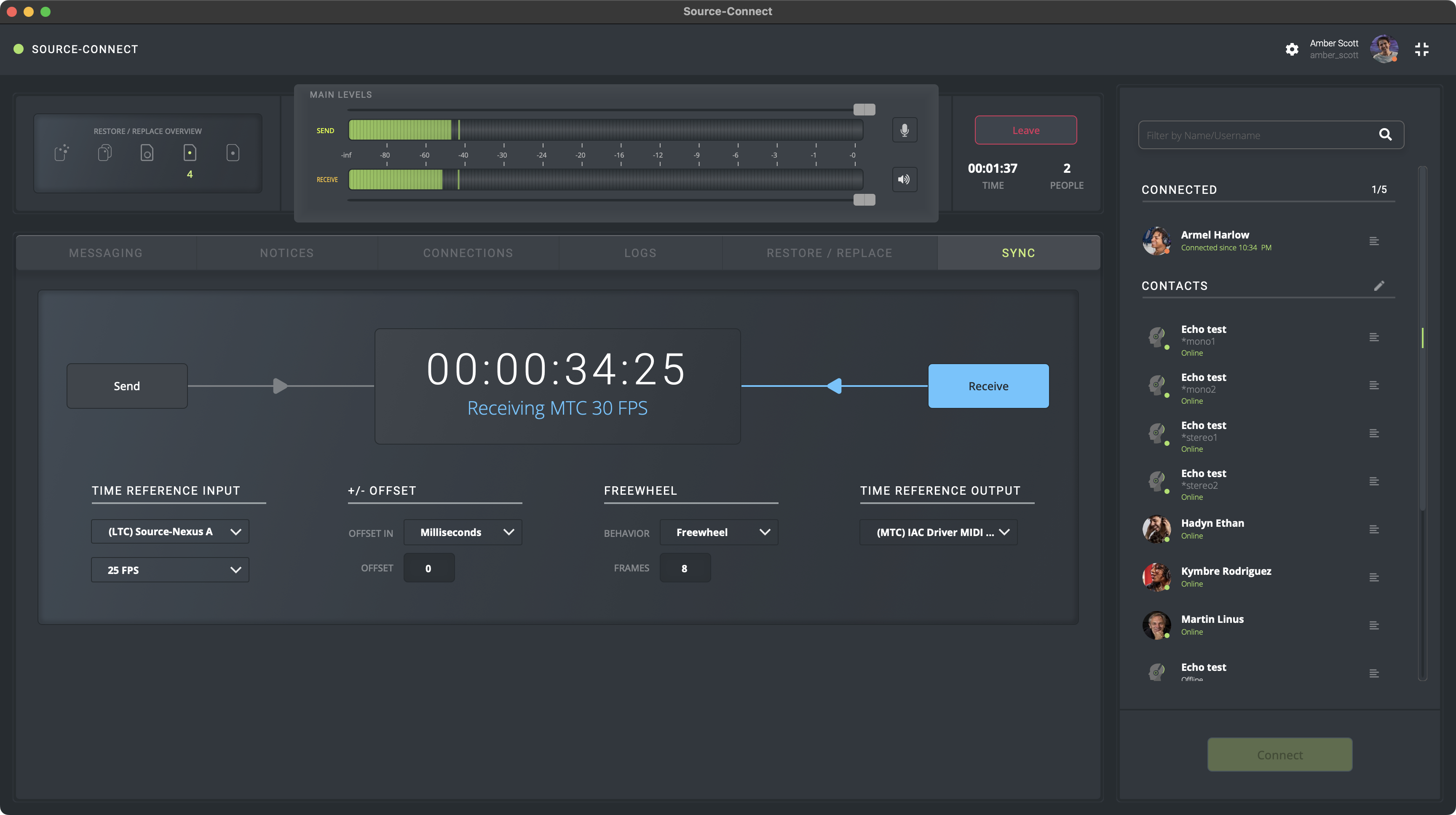 El talento (Amber, que está en Source-Connect Studio) recibe el código de tiempo: