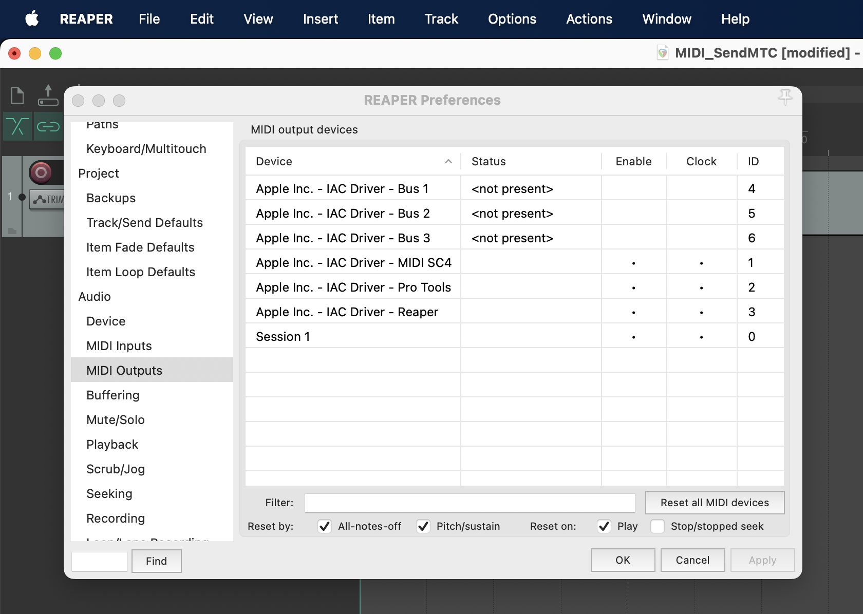 - En Reaper, ve a Reaper > Configuración > Audio > Salidas MIDI y asegúrese de que el dispositivo MIDI que creó para enviar MTC esté habilitado y tenga el reloj habilitado.