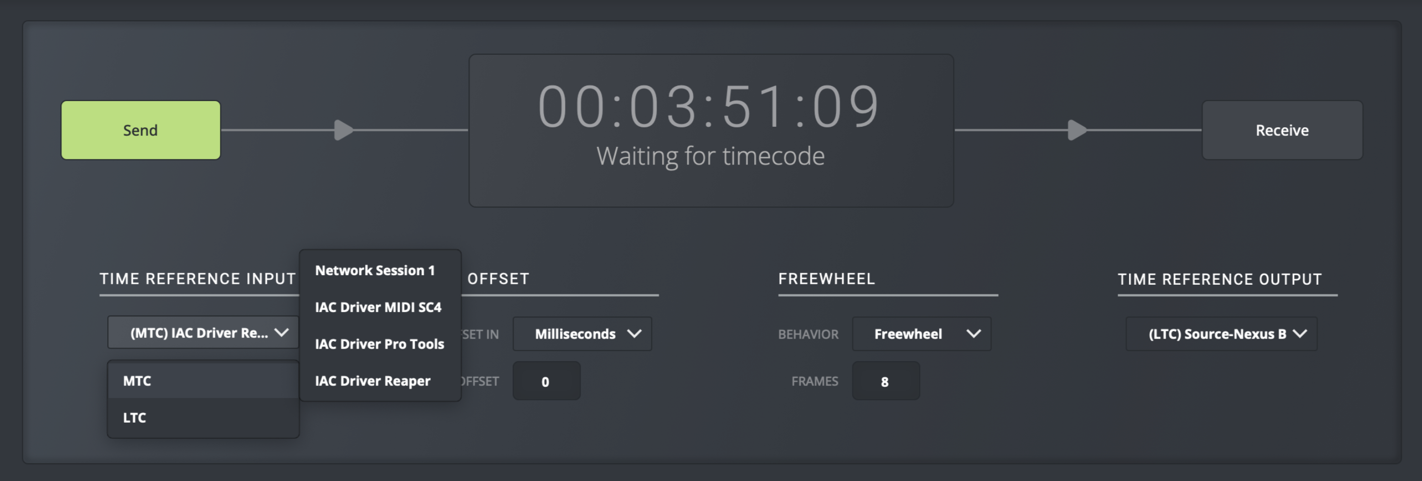 - En "ENTRADA DE REFERENCIA DE TIEMPO", seleccione "MTC" y el nombre de su dispositivo MIDI (lo llamamos "MIDI Reaper" arriba).
