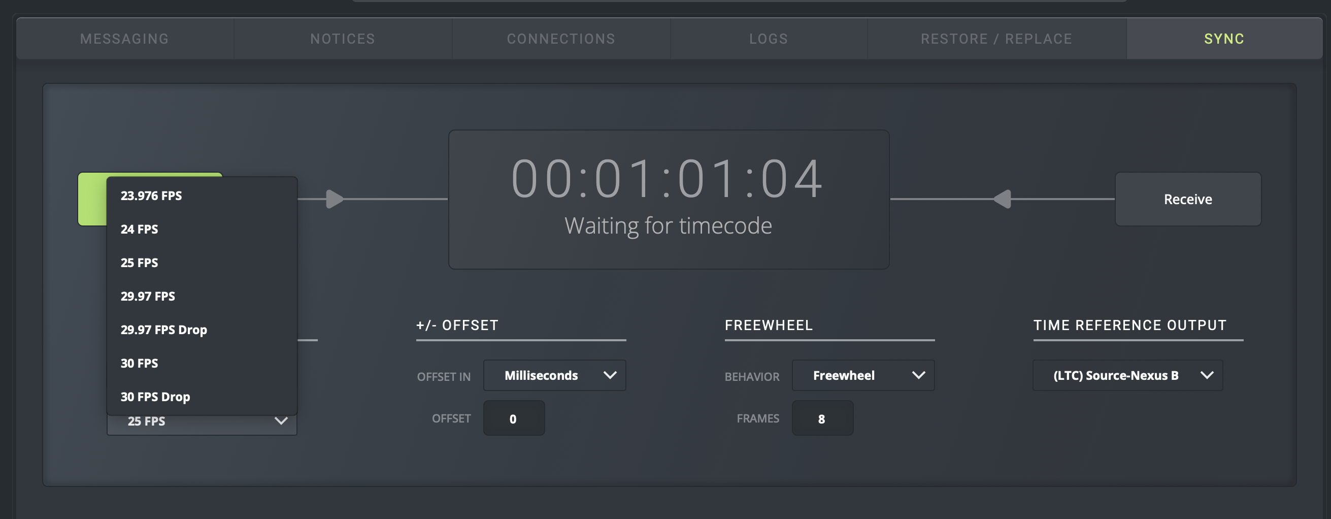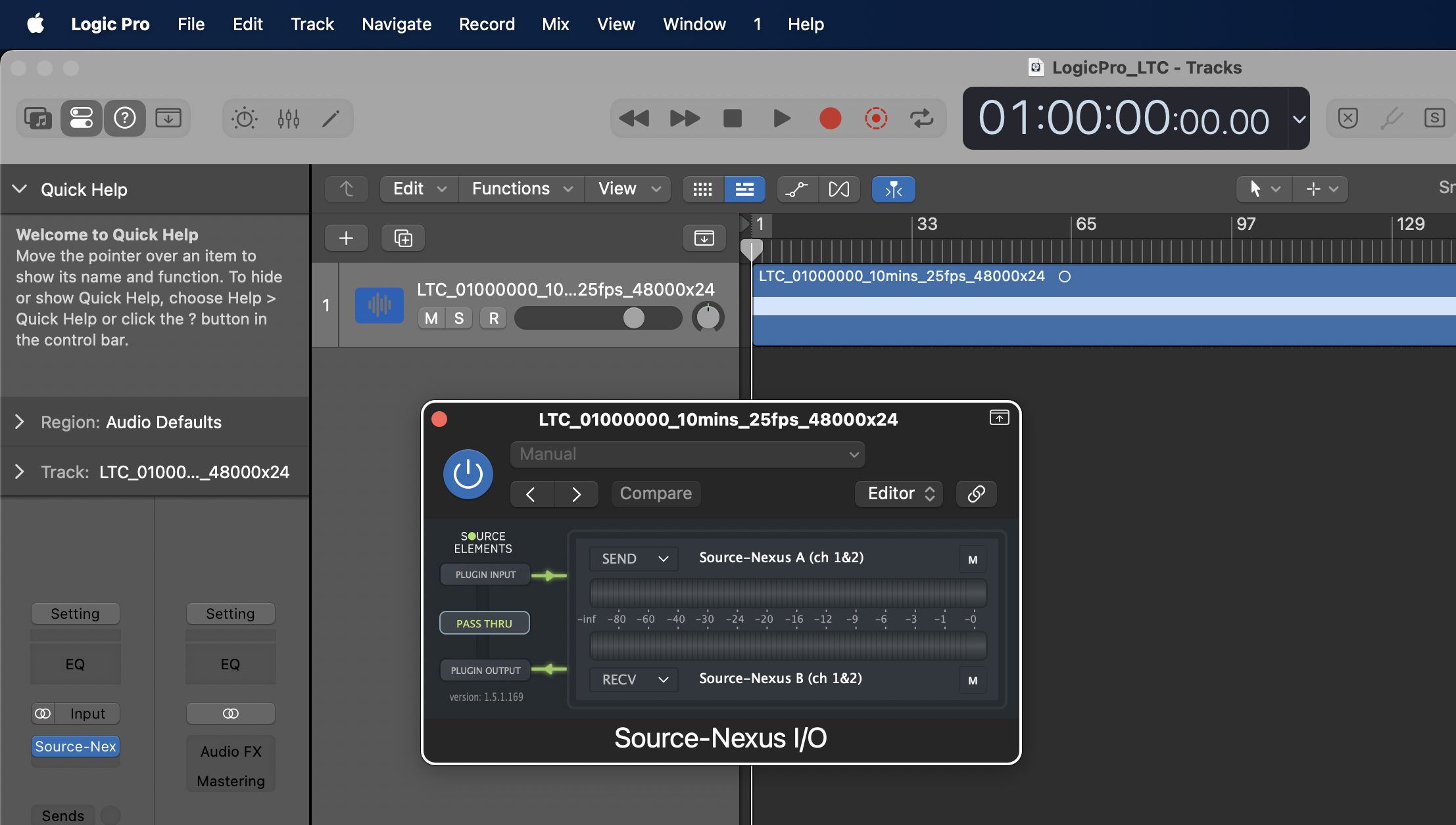 - Agrega Source-Nexus como una inserción en la pista donde está tu código de tiempo LTC. Para este ejemplo, hemos incluido un código de tiempo LTC de muestra en 25 fps: