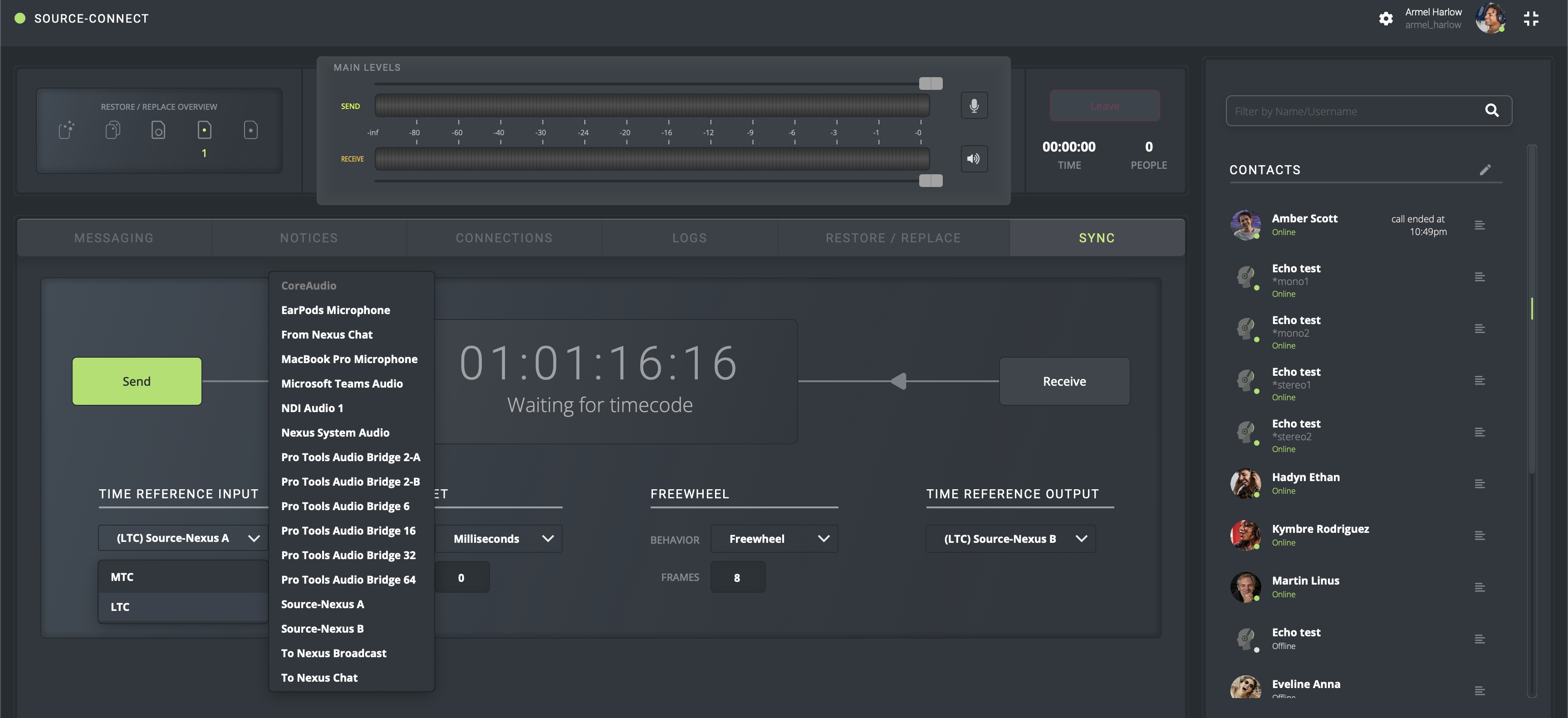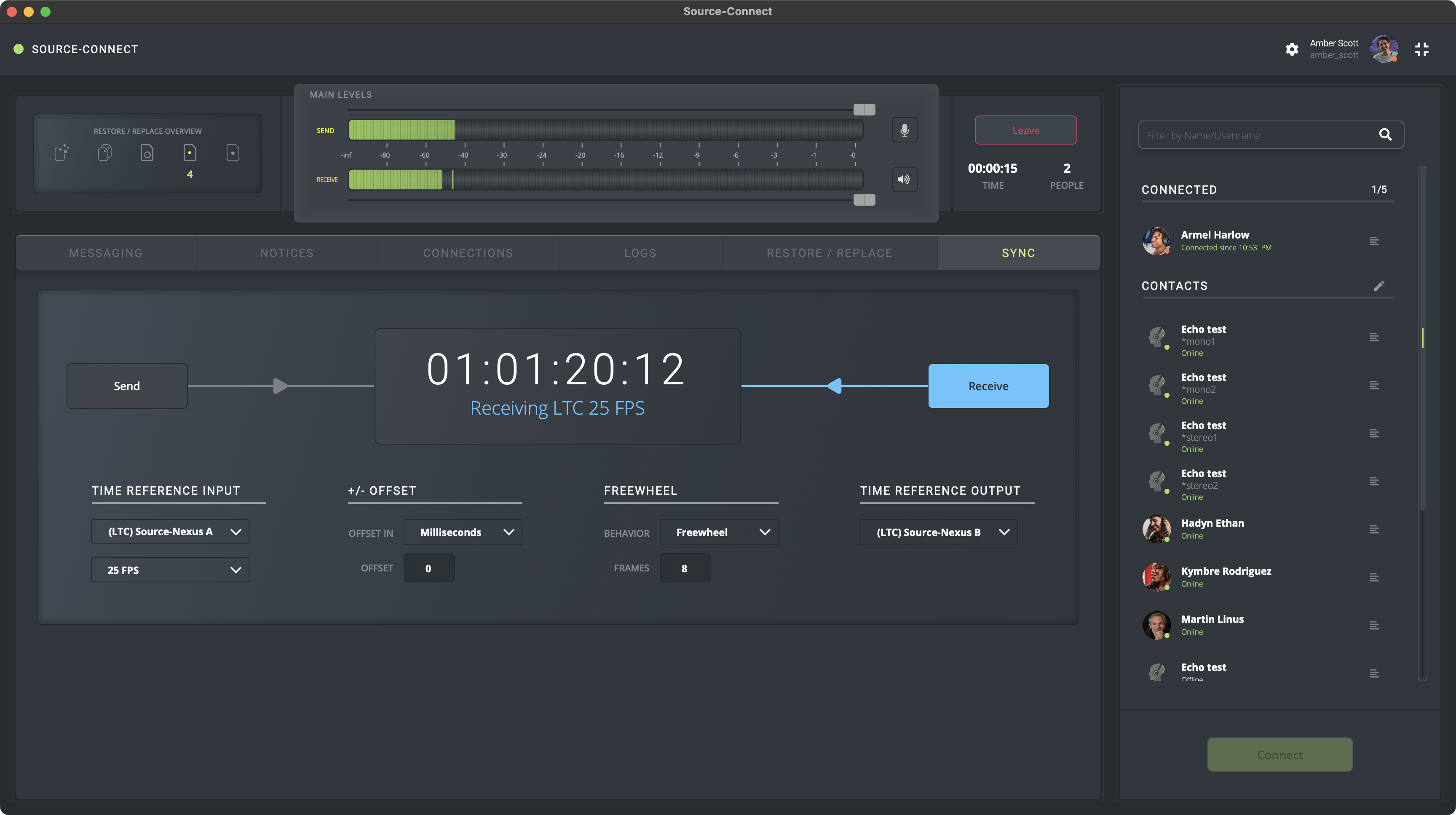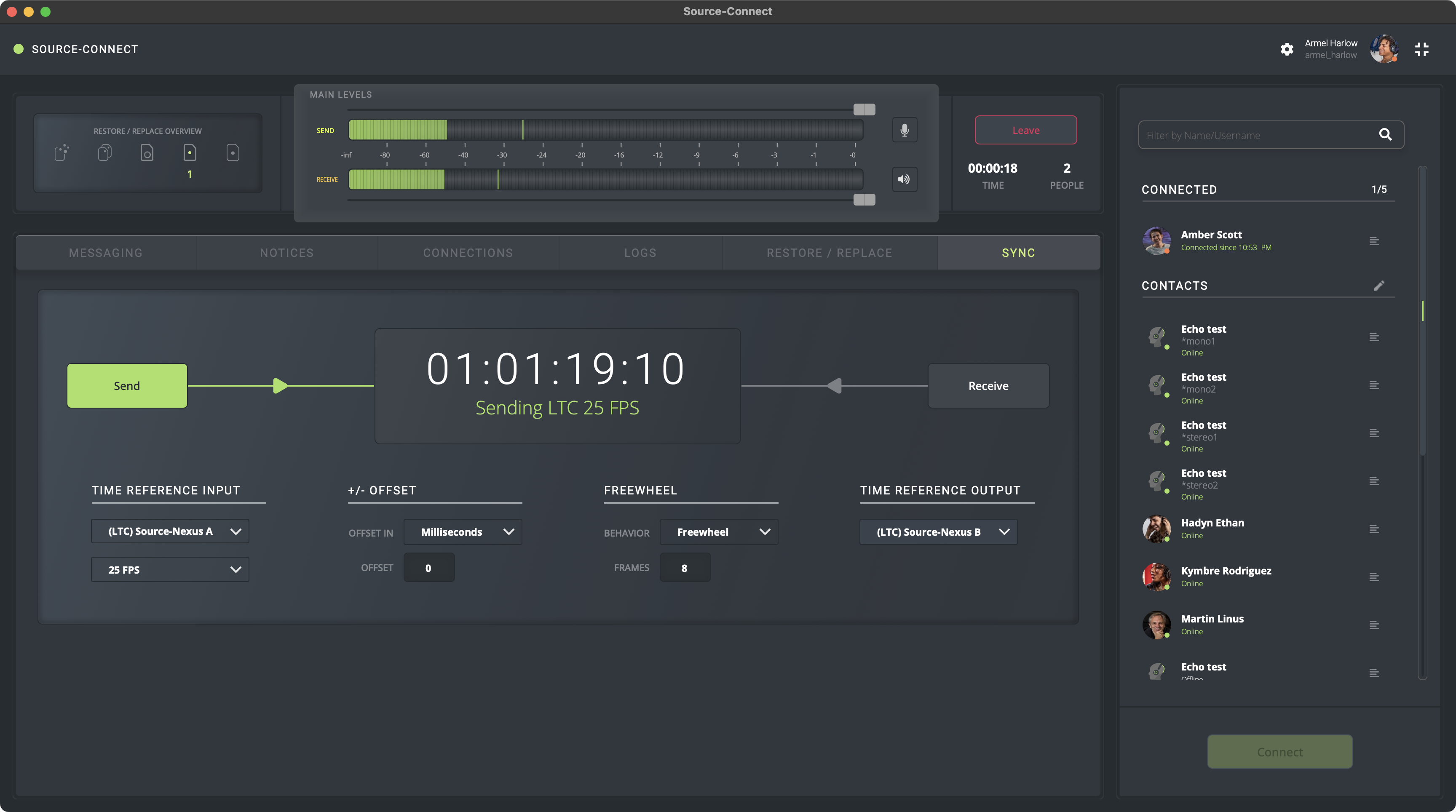 En el siguiente ejemplo, Logic Pro envía código de tiempo utilizando “Logic Pro Virtual In”, que es visible en la pestaña RTS de Source-Connect 4. El usuario “Armel” está enviando el código de tiempo RTS: