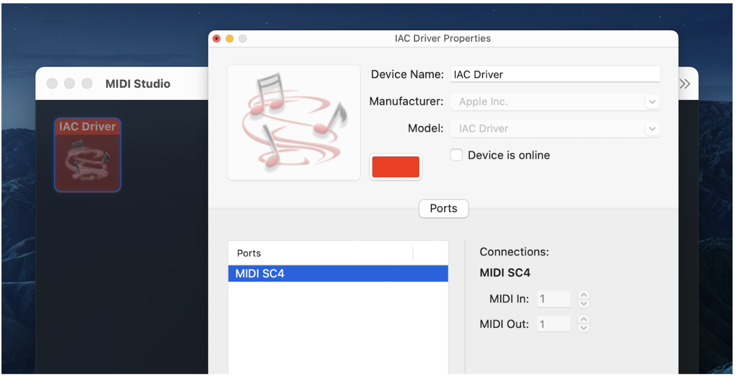 - En la sección "Puertos", cree un nuevo puerto y cámbiele el nombre si es necesario. En el caso siguiente, lo hemos denominado “MIDI SC4”.