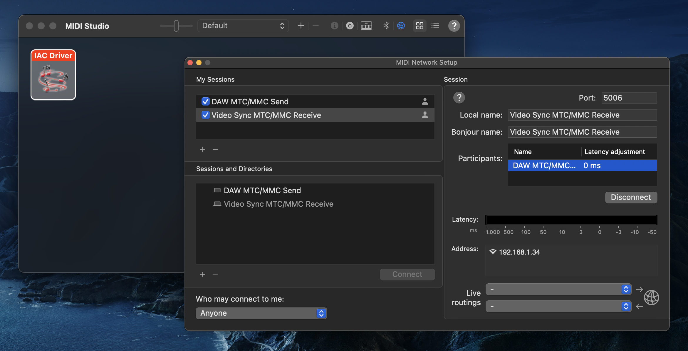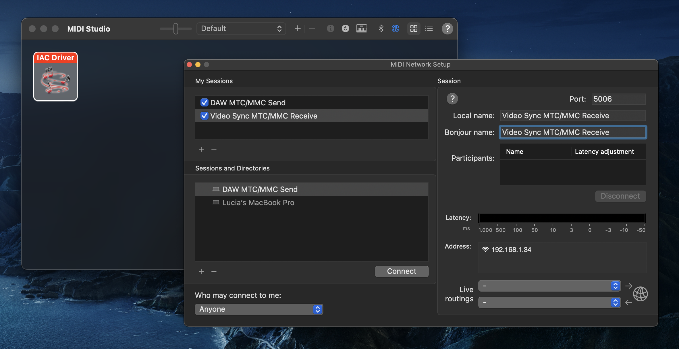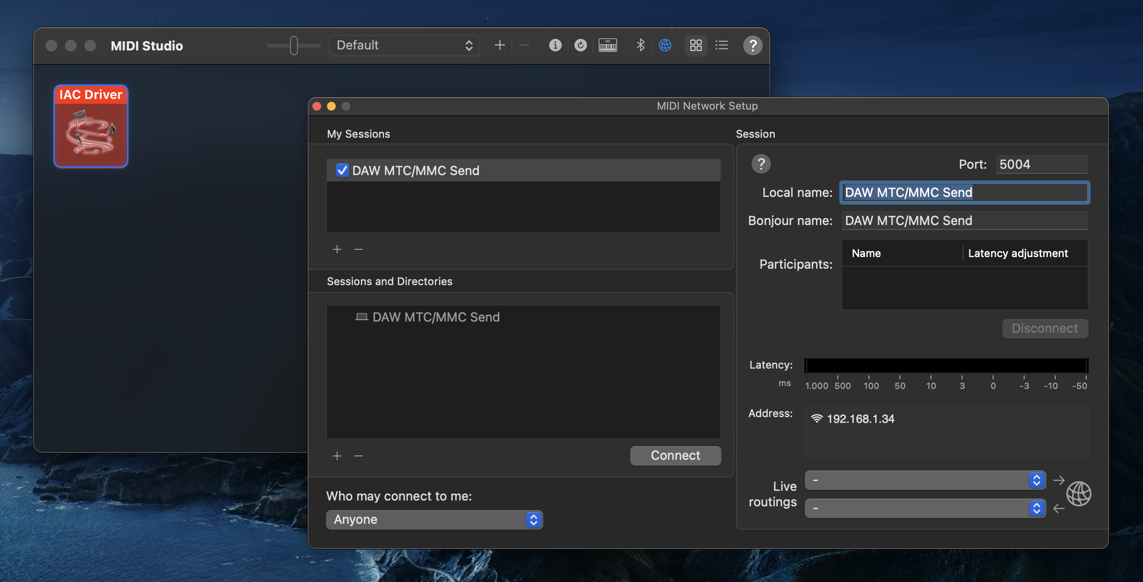 - Verá "Envío DAW MTC/MMC" en "Participantes" como evidencia de que las sesiones de red MTC/MMC están conectadas.