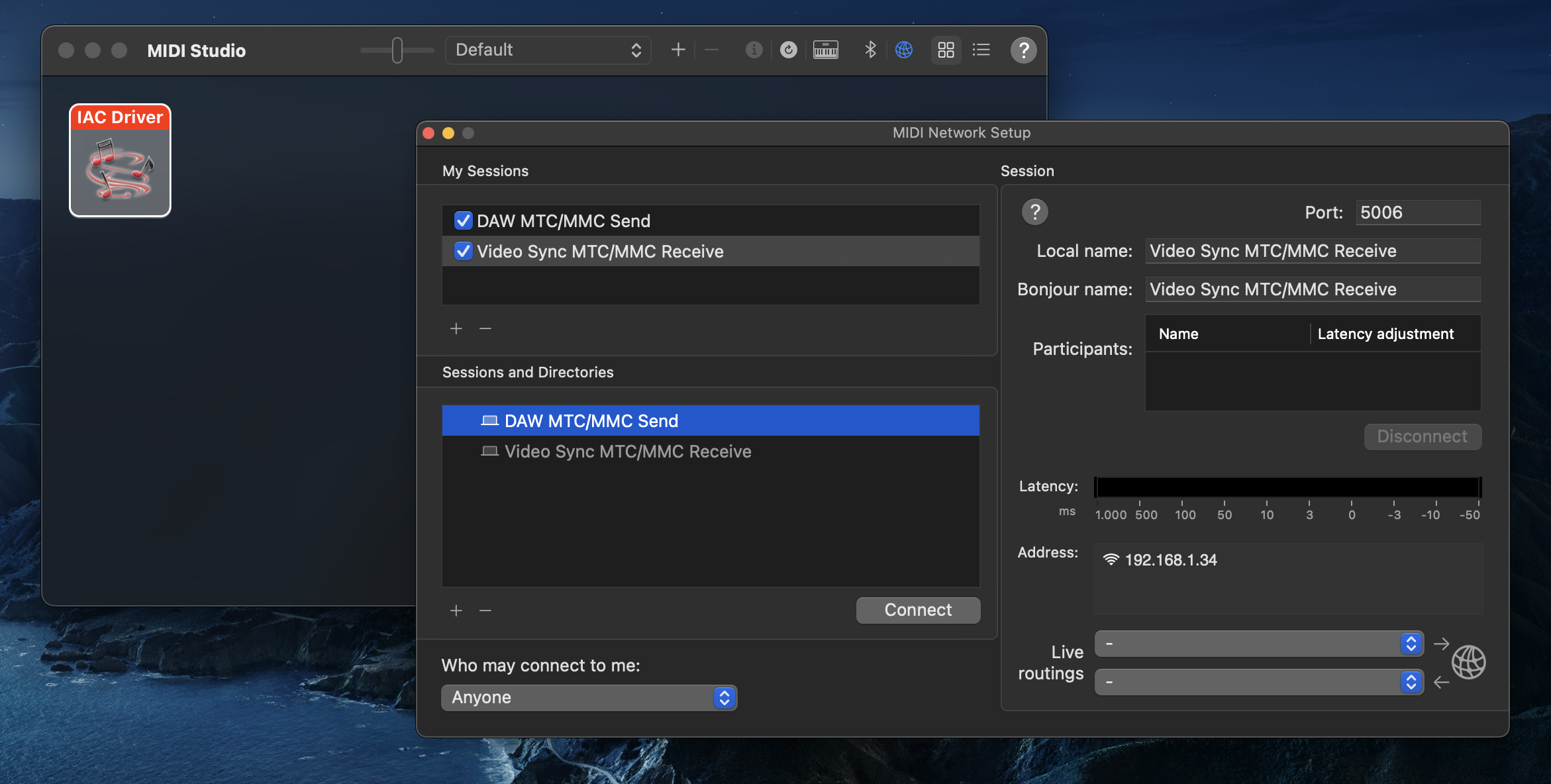 - Con "Envío DAW MTC/MMC" seleccionado en "Sesiones y directorios", haga clic en "Conectar".