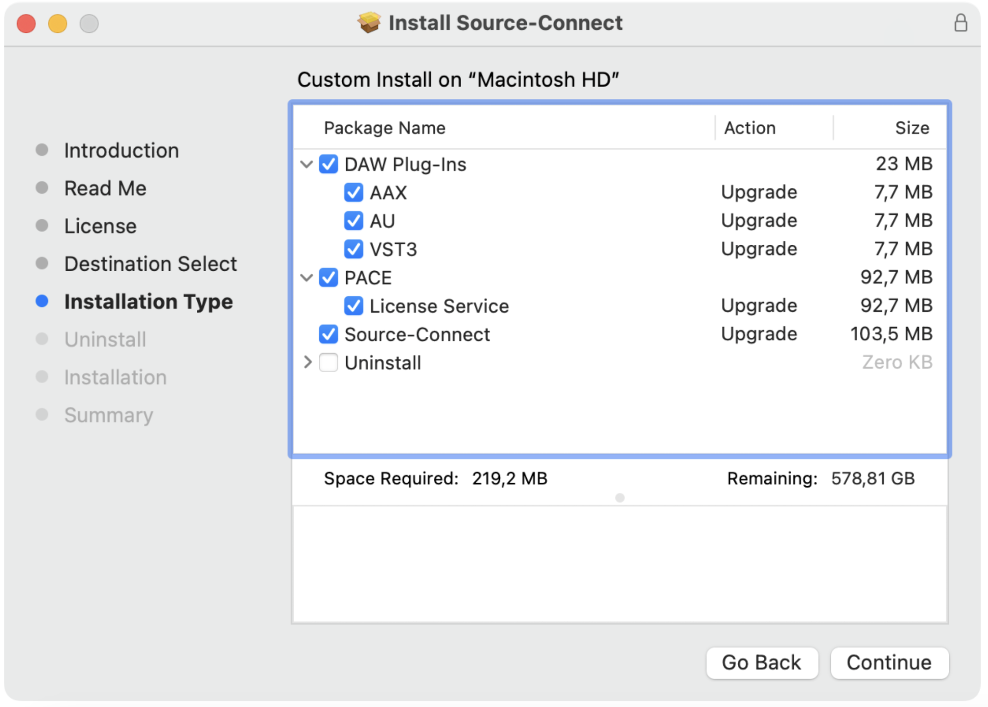 Una vez que haya descargado el software, abra el instalador de DMG y siga las instrucciones. Si desea instalar Source-Connect I/O, asegúrese de marcar la casilla "Complementos DAW" y seleccionar los formatos apropiados. Todos los complementos se instalan de forma predeterminada. Encuentre más información sobre el complemento Source-Connect I/O en este artículo .