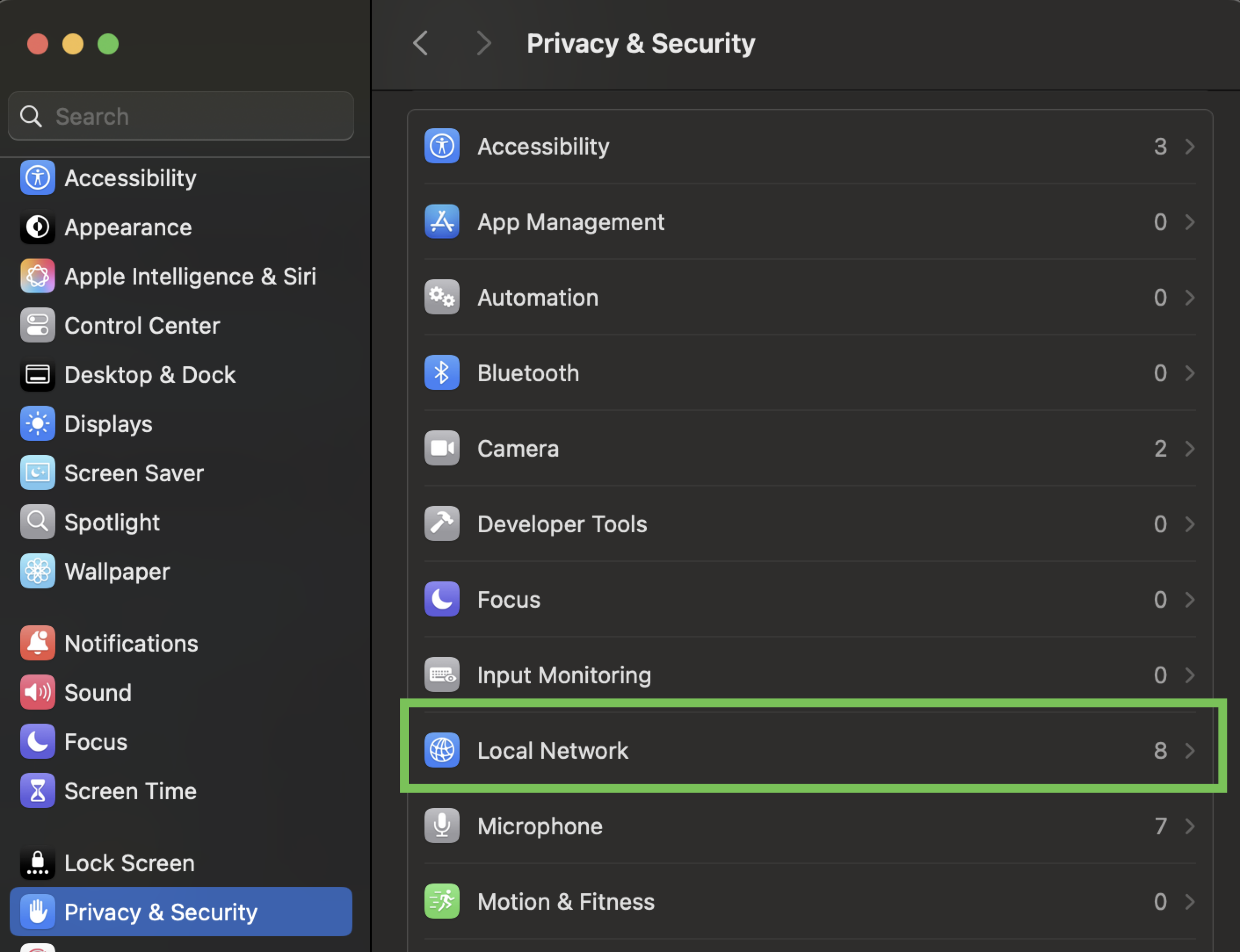 1. Ve a Configuración del Sistema > Privacidad y Seguridad > “Red Local”: