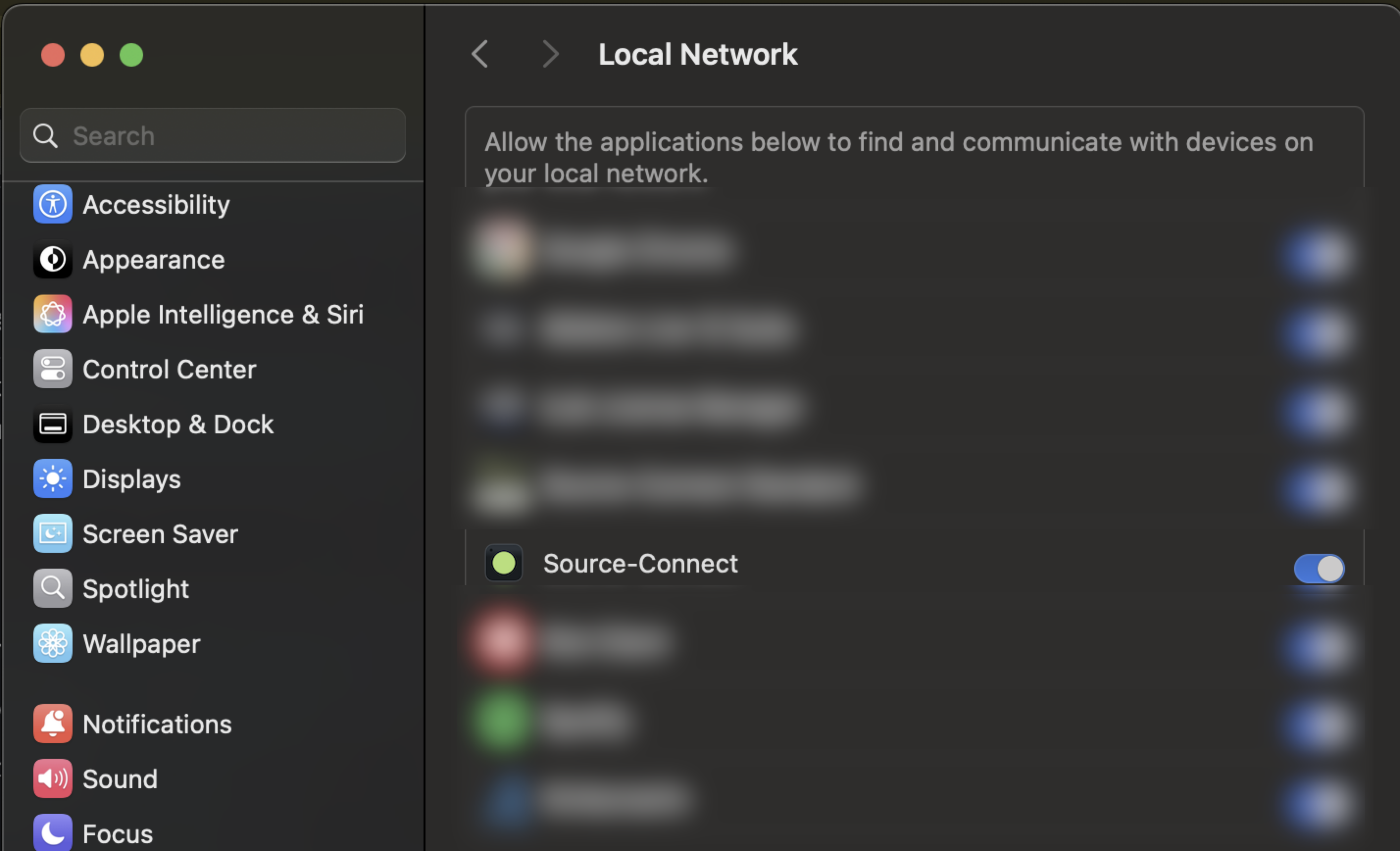 La primera vez que instales Source-Connect 4, verás un aviso de la aplicación pidiendo que le otorgues acceso a Source-Connect para la red local para poder encontrar dispositivos. Asegúrate de hacer clic en “Permitir” si quieres utilizar Source-Connect I/O - de lo contrario, el complemento no aparecerá como una opción en el menú desplegable de entrada/salida: