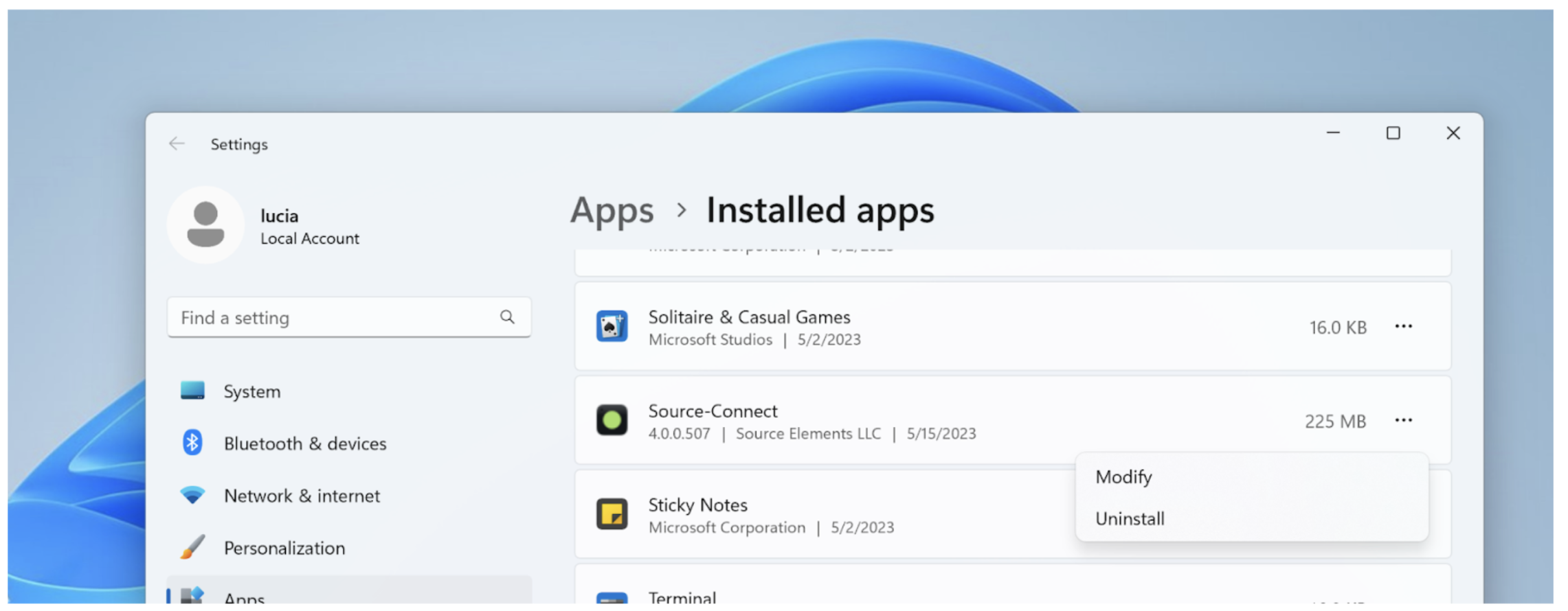 Para desinstalar Source-Connect, haga clic en el icono de inicio y escriba "Agregar o quitar programas". Luego, busque o Source-Connect y haga clic en el botón de desinstalar. A continuación, verá el flujo de trabajo para Windows 10 y Windows 11.