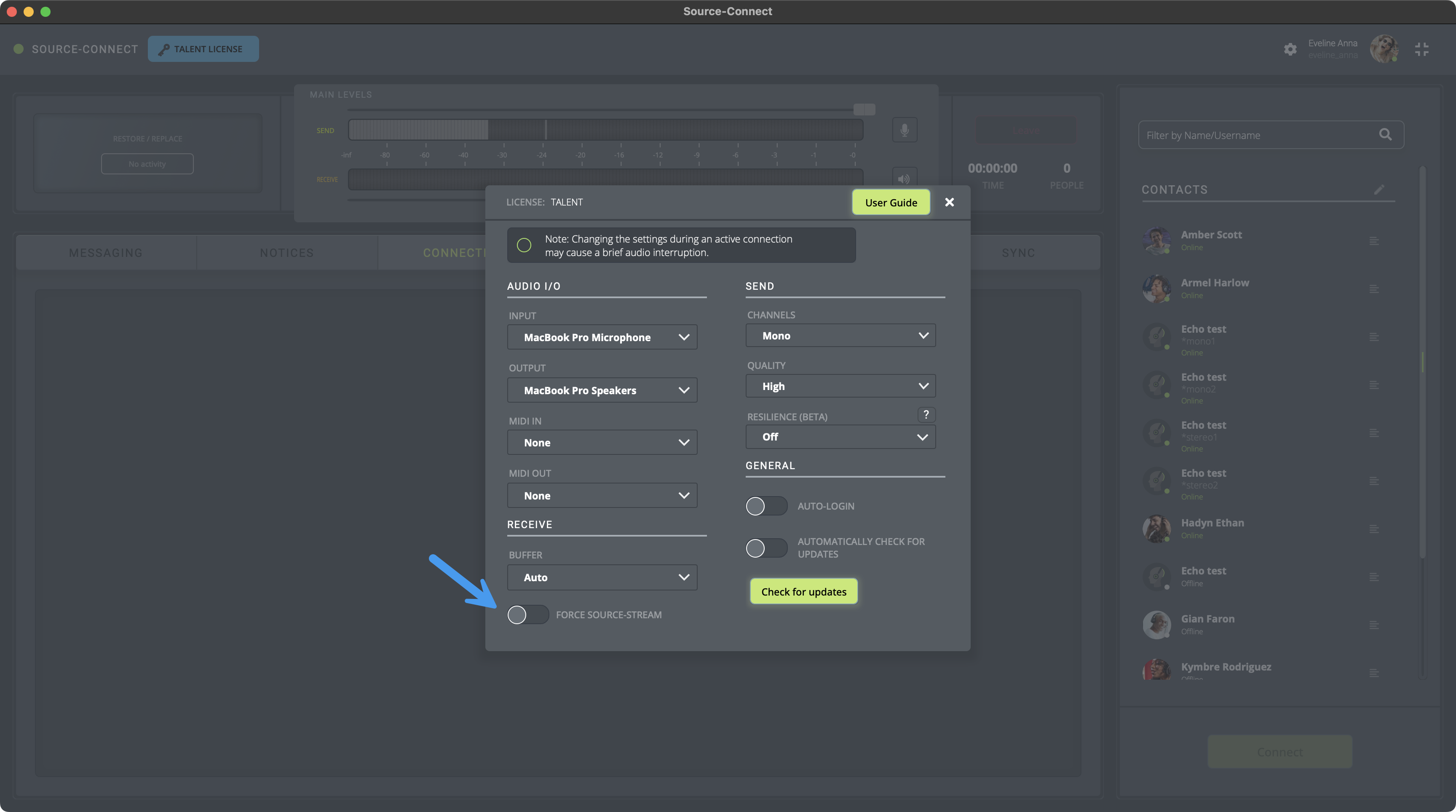 Hay una opción "Forzar Source-Stream" en el menú de configuración en todas las versiones de Source-Connect 4: