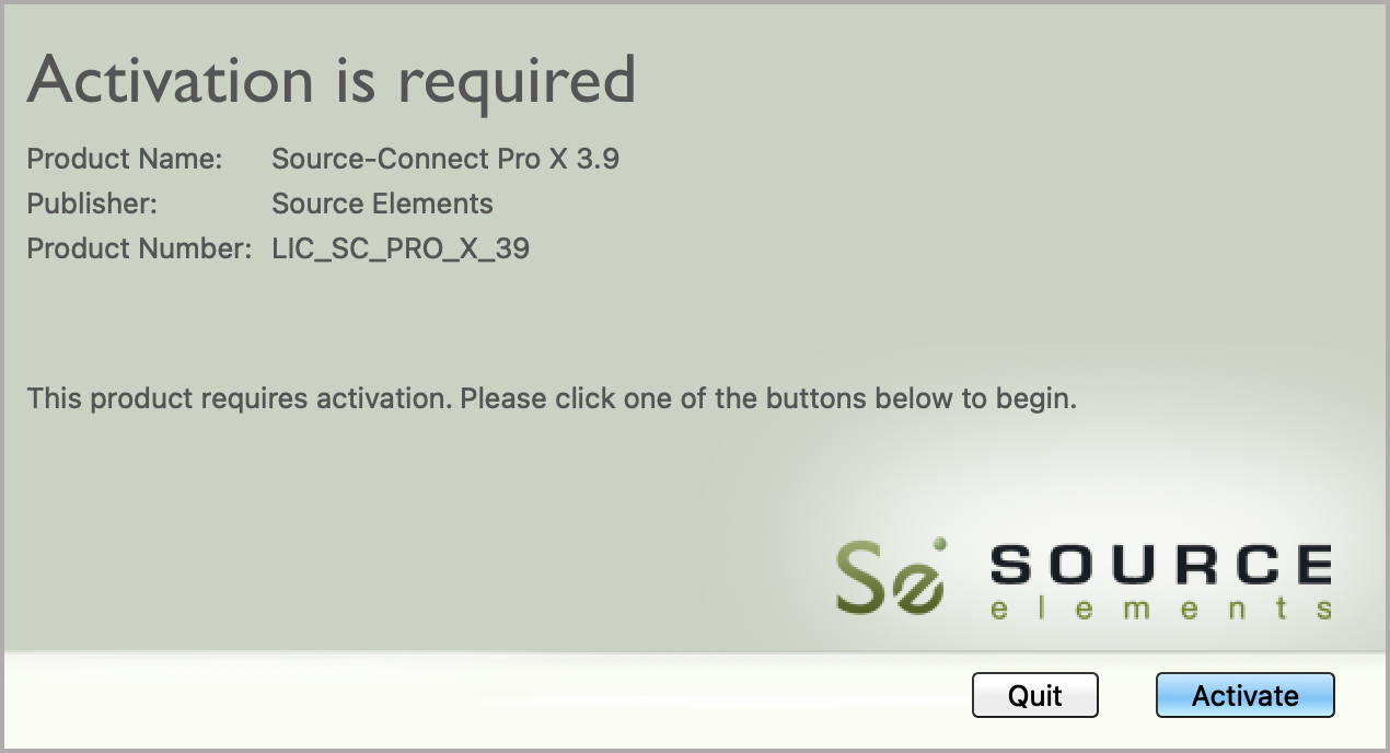 This article is part of the Source-Connect 3.9 User GuideSi no hay ningún iLok activado en su computadora (o dongle iLok ) la primera vez que inicia Source-Connect Standard , la aplicación mostrará "Se requiere activación".