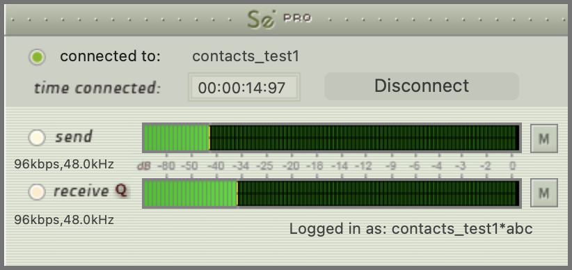 This article is part of the Source-Connect 3.9 User GuideCuando la sesión se establece correctamente, las propiedades de la sesión actual se muestran en el panel Estado. Se le informa sobre la calidad de la tasa de bits y la frecuencia de muestreo que se envían y reciben, y si está realizando la conversión de frecuencia de muestreo.