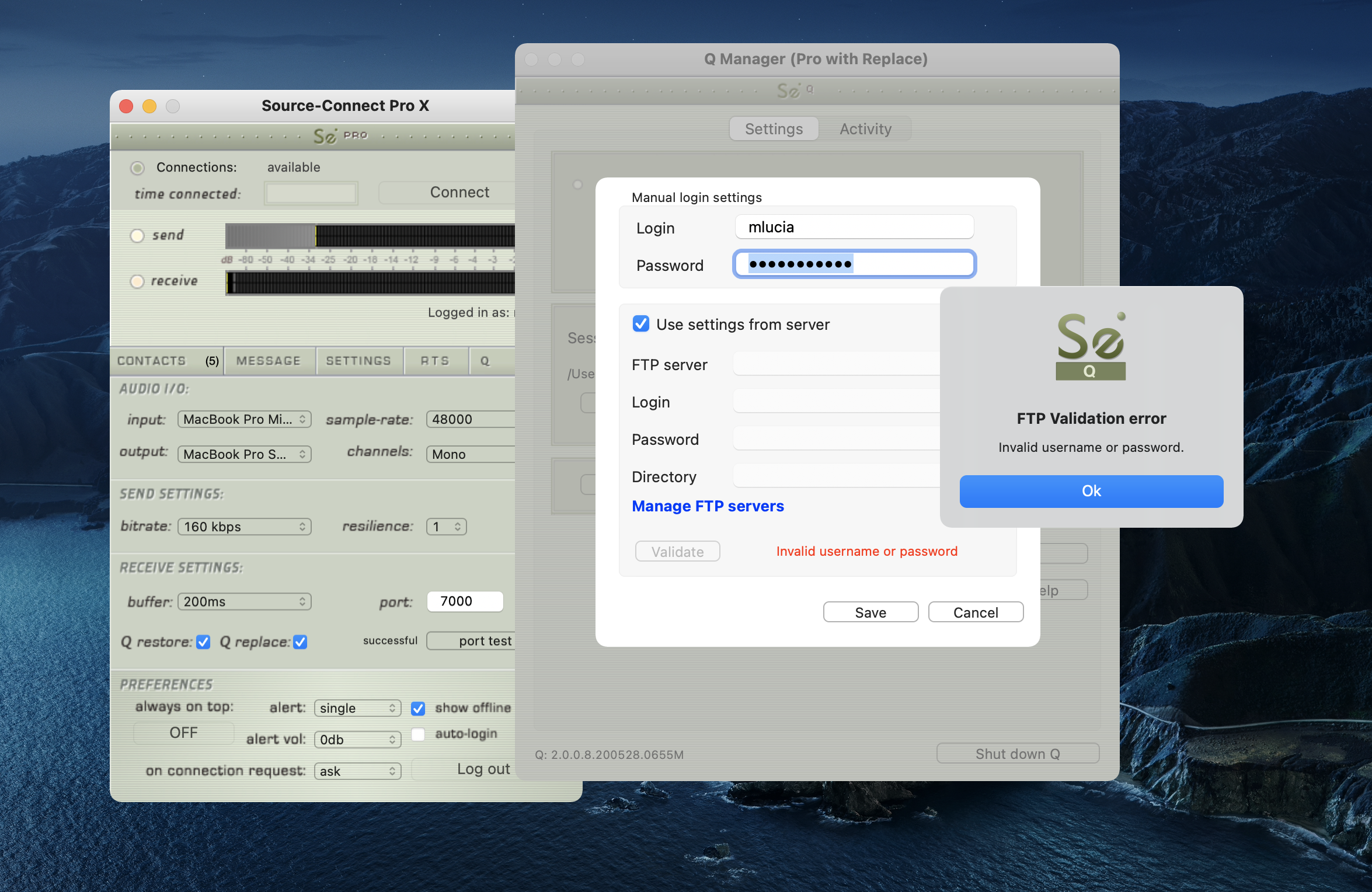 Error de validación de FTP: nombre de usuario o contraseña no válidos