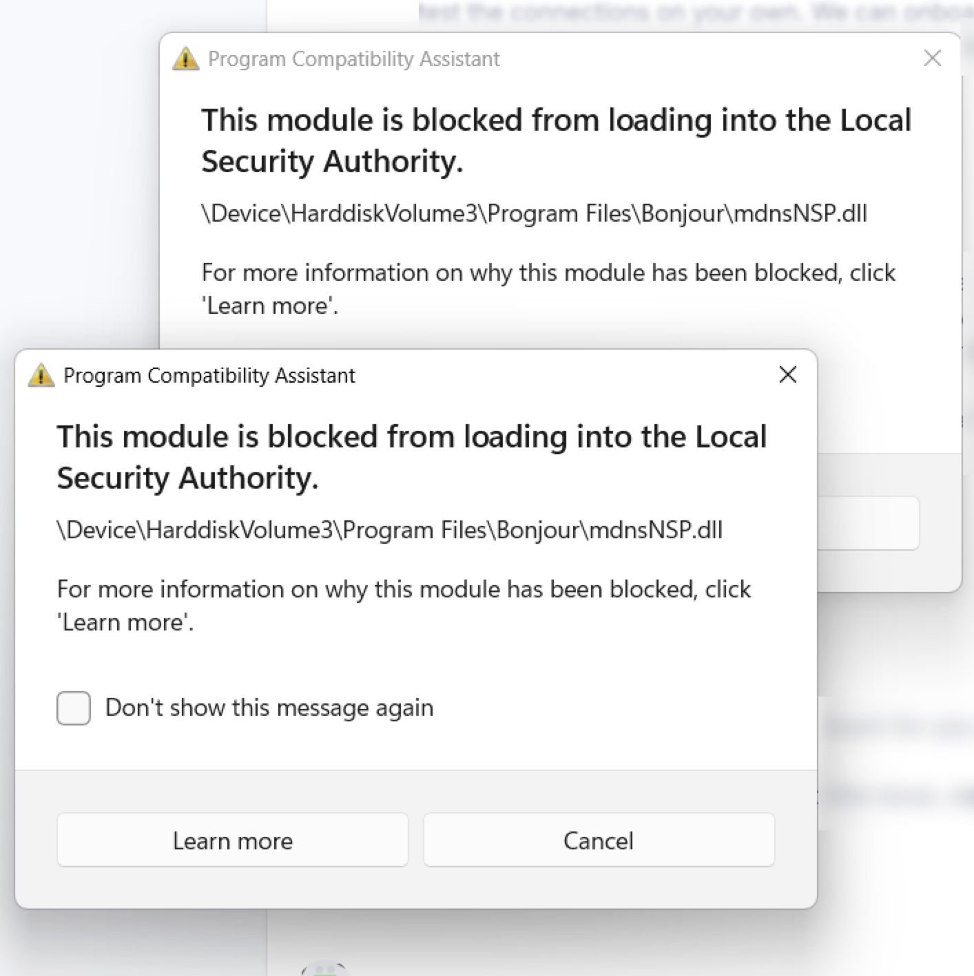 Bonjour es un servicio utilizado por el plugin Source-Connect I/O para DAW. Este servicio opcional proporciona conectividad entre Source-Connect y tu DAW. Bonjour no es compatible con algunas versiones nuevas de Windows porque Apple, su proveedor, no ha publicado una actualización oficial. Al instalar Bonjour en los sistemas afectados, se mostrarán estos errores al iniciar Source-Connect 4.
