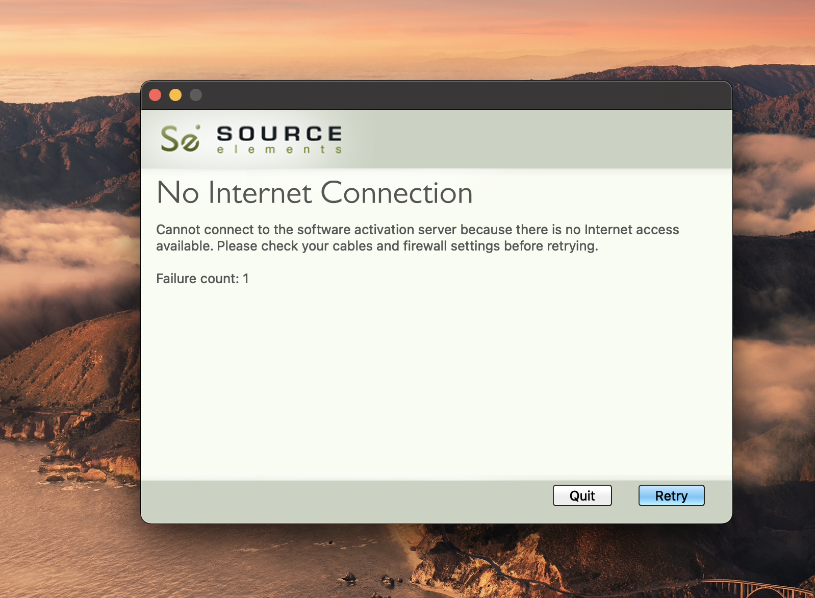 Si el mensaje de error está relacionado con su red, asegúrese de tener acceso a Internet intentando ir a nuestro sitio web http://source-elements.com/ . Si no tiene acceso a Internet, intente reiniciar su enrutador y computadora e inicie la aplicación nuevamente. Si puede acceder a nuestro sitio web a través del navegador web, pero aún no puede activar su versión de prueba o licencia, comuníquese con el equipo de soporte .