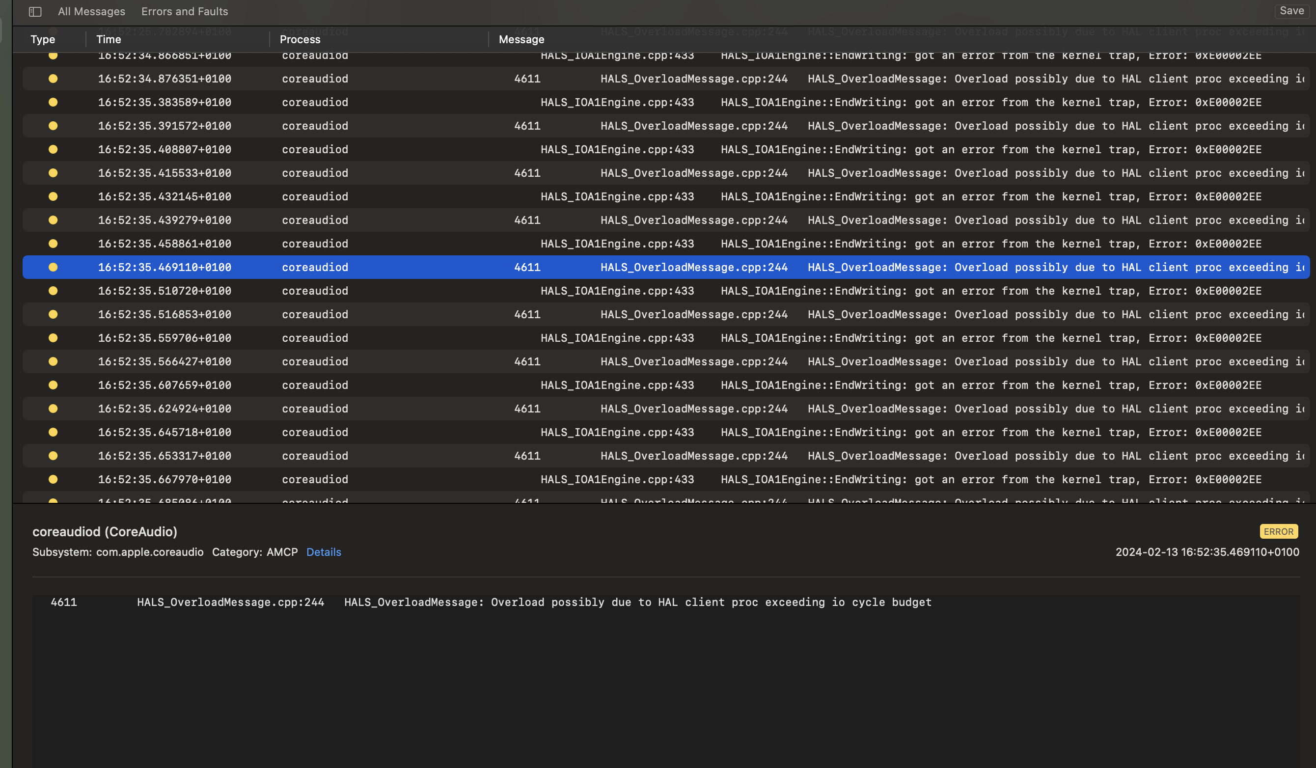 - Desencadena el comportamiento varias veces. Deberías ver mensajes de error llamados "HALS_OverloadMessage" en el registro cuando se producen las interrupciones (a veces puede pasar un minuto antes de que aparezcan, la marca de tiempo antes del error mostrará la hora real en que ocurrió).