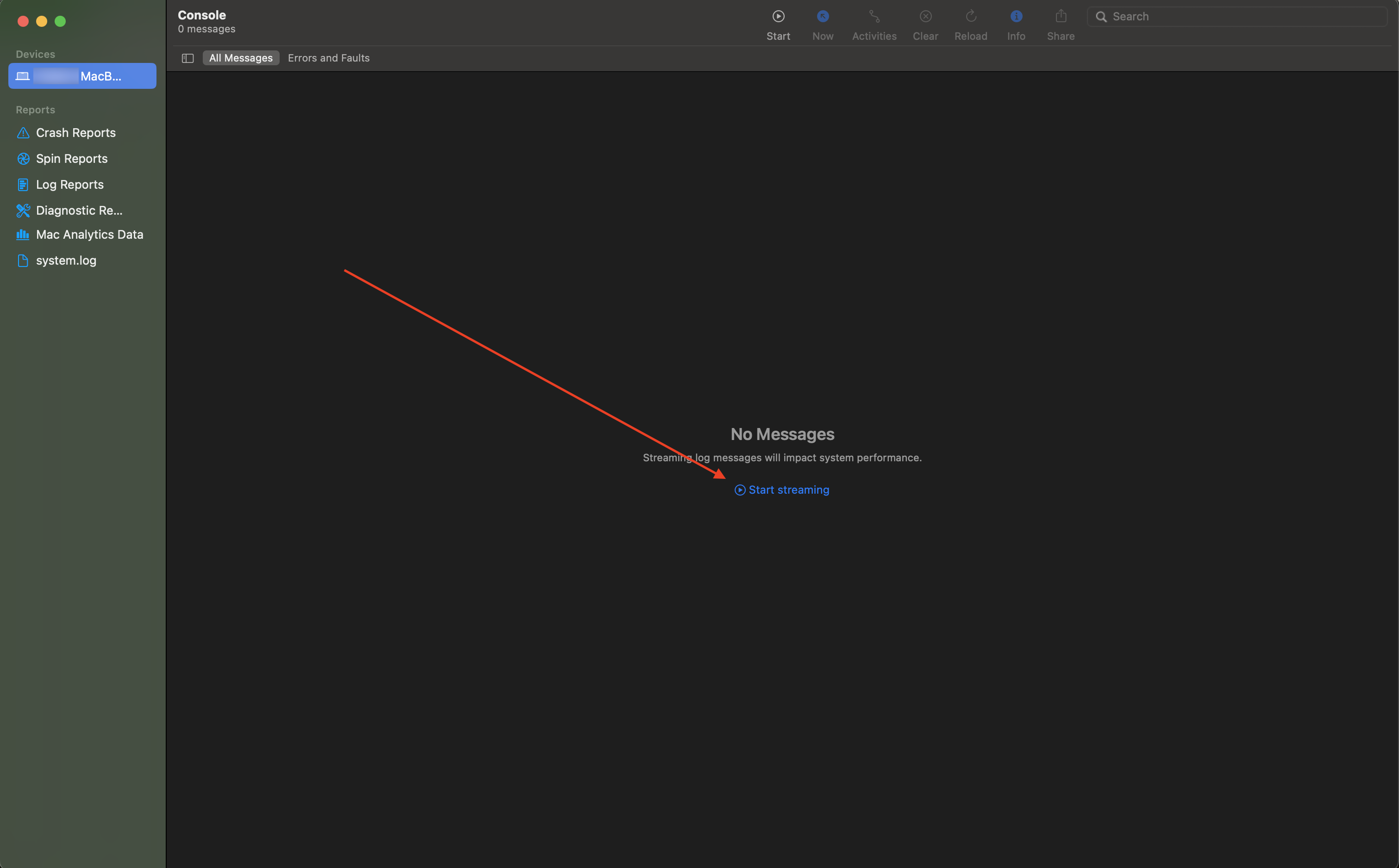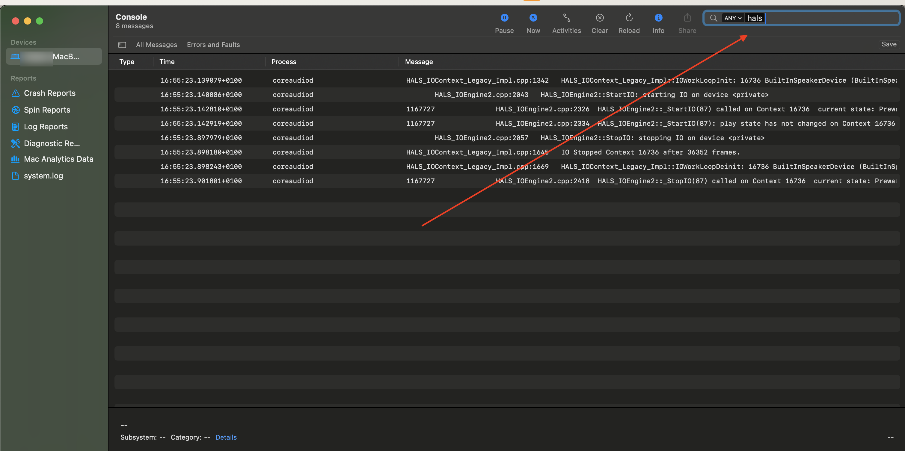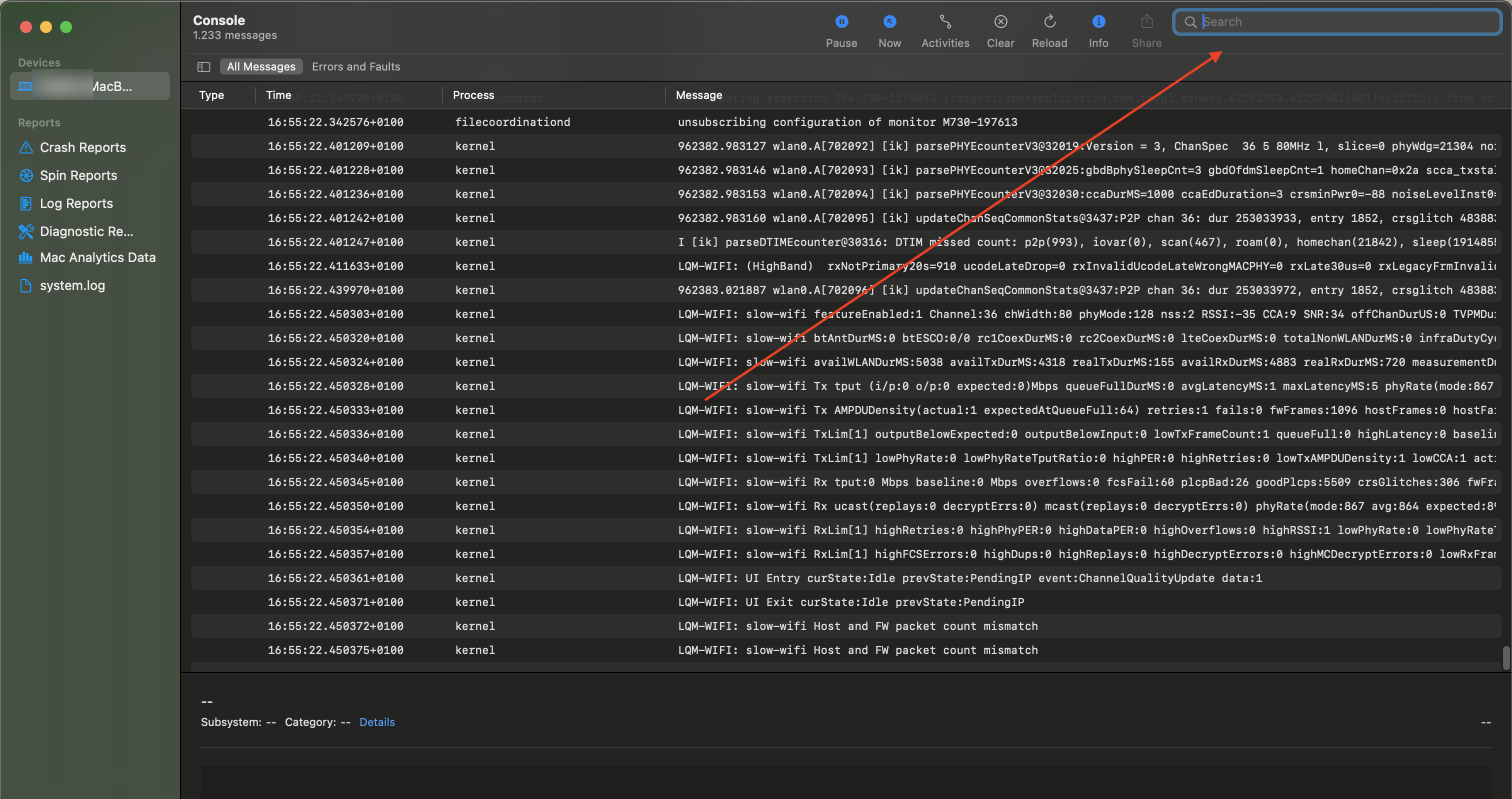 - Abre la aplicación “Console.app”