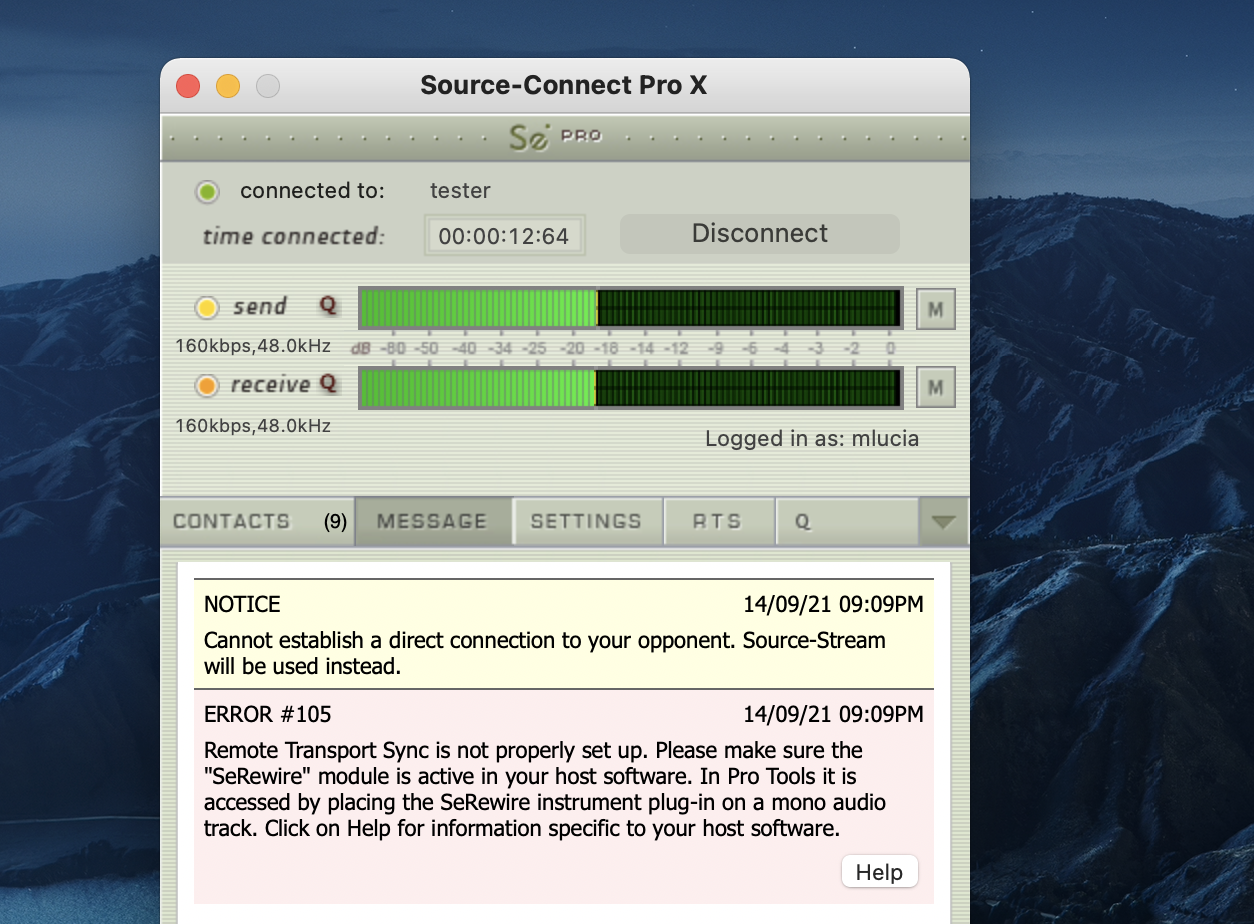 Los usuarios intentan utilizar Source-Connect con Remote Transport Sync y reciben el siguiente mensaje de error: