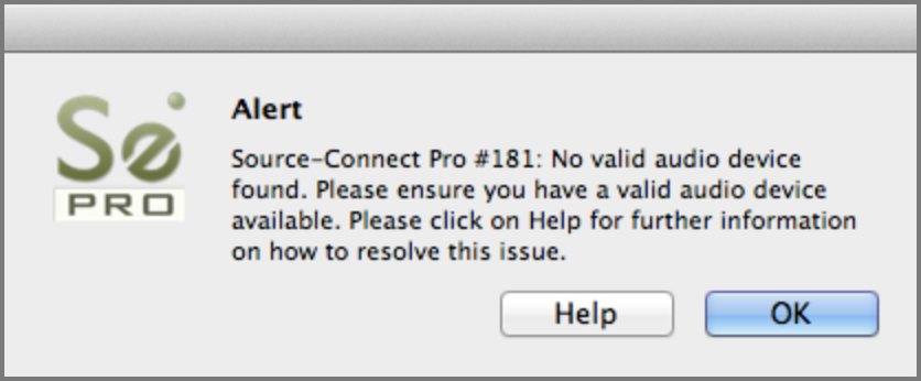 This article contains troubleshooting informationSource-Connect #181: No se encontró ningún dispositivo de audio válido. Asegúrese de tener un dispositivo de audio válido disponible. Haga clic en Ayuda para obtener más información sobre cómo resolver este problema.