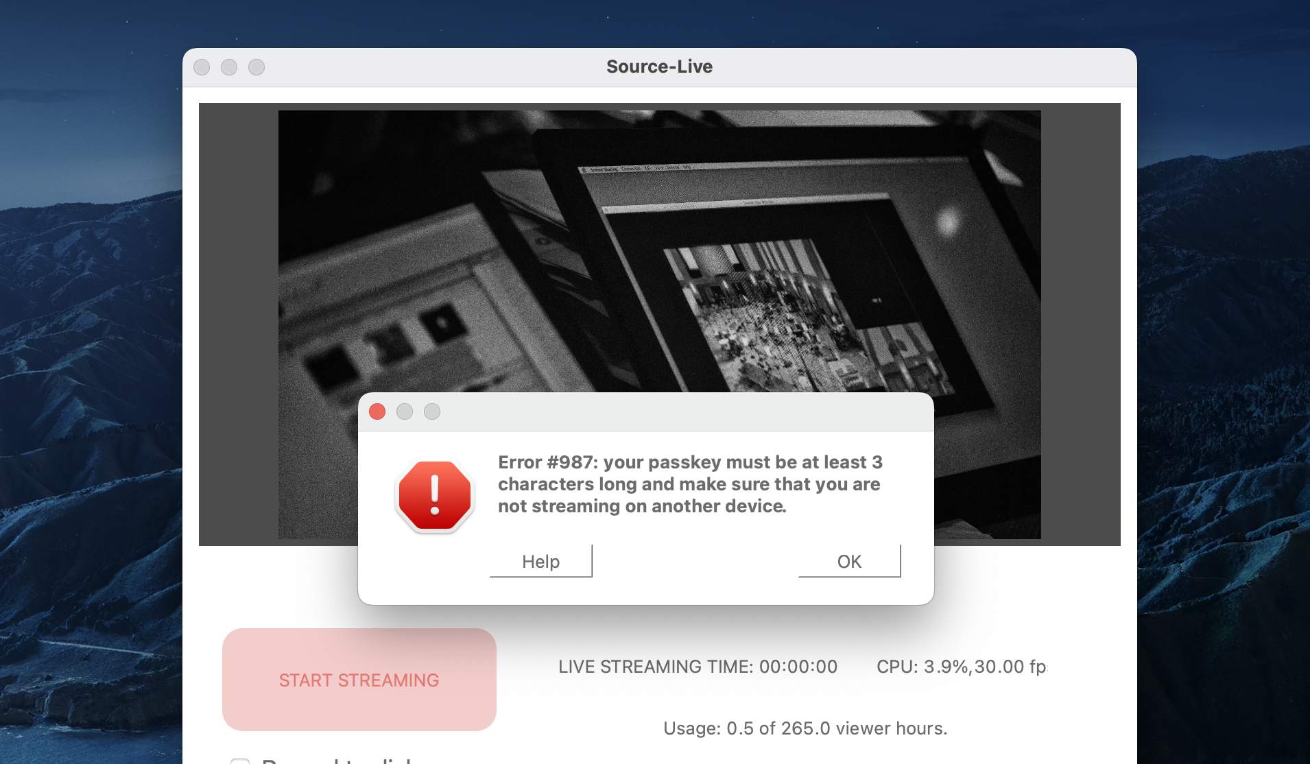 Cuando los usuarios intentan hacer clic en "INICIAR TRANSMISIÓN" en Source-Live Pro LL para comenzar una sesión de transmisión, reciben el siguiente mensaje de error: