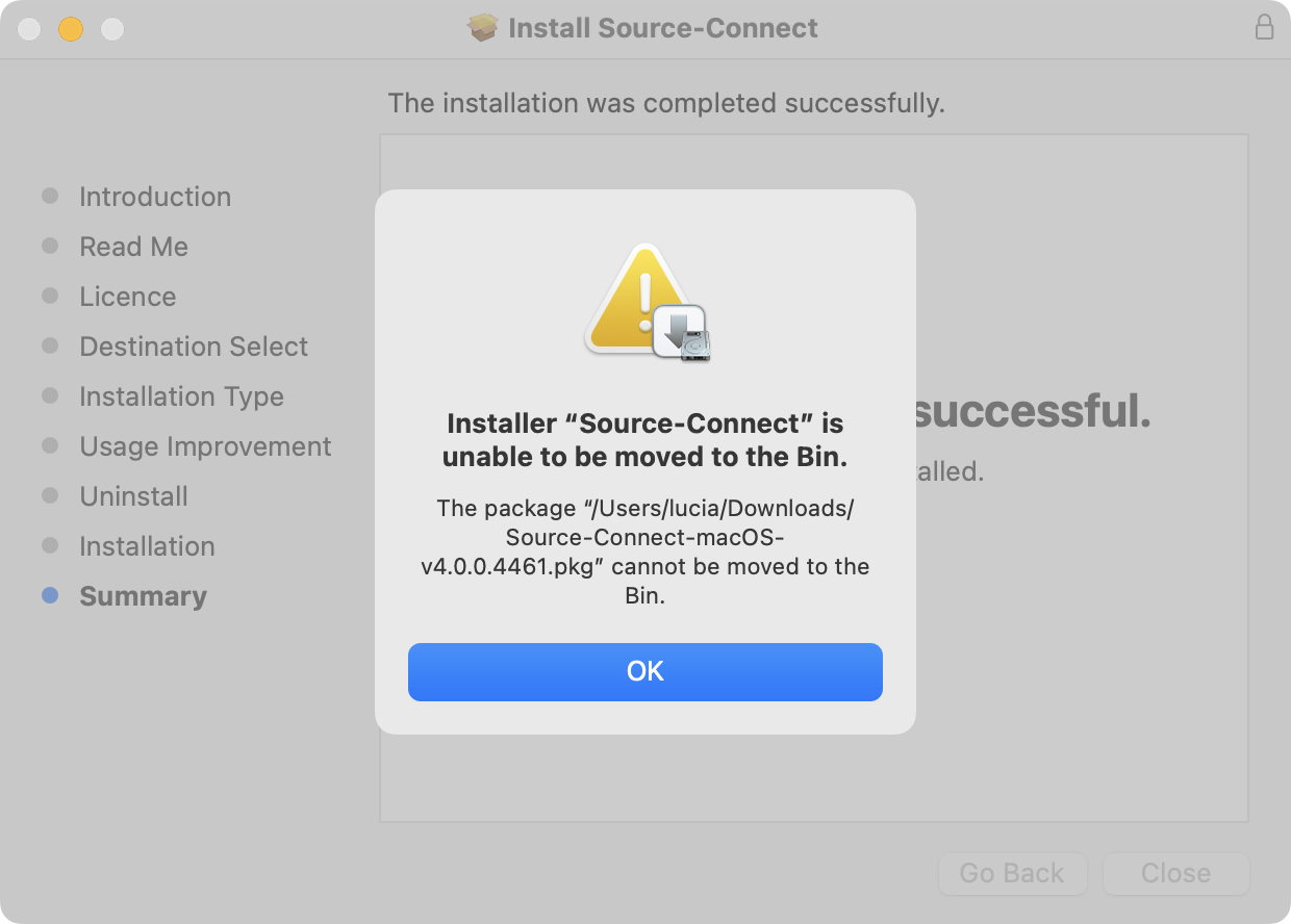 El paquete “/Users/xxxxx/Downloads/Source-Connect….pkg” no se puede mover a la papelera.