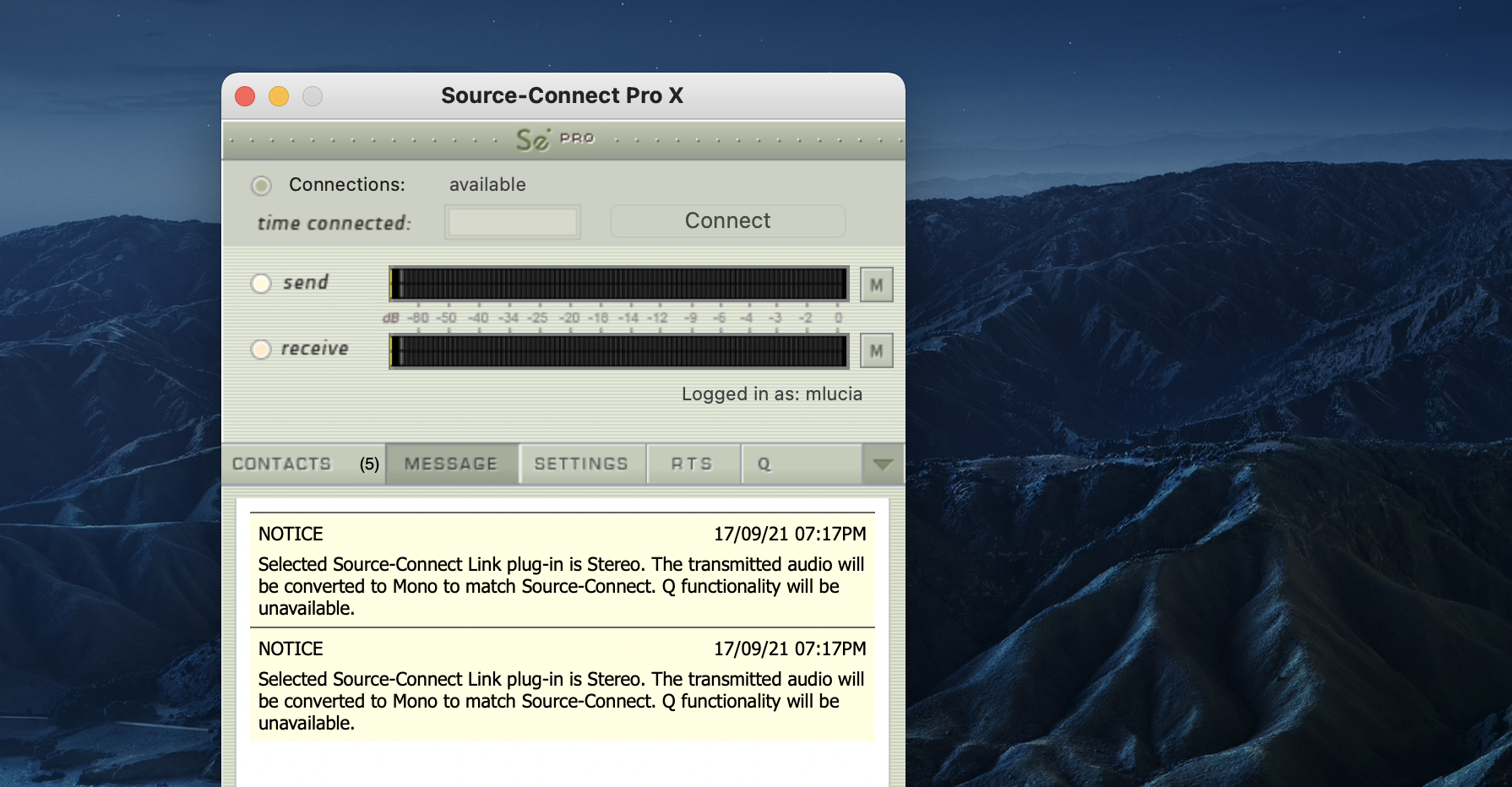 El complemento Source-Connect Link seleccionado es estéreo. El audio transmitido se convertirá a estéreo para coincidir con Source-Connect . La funcionalidad Q no estará disponible.