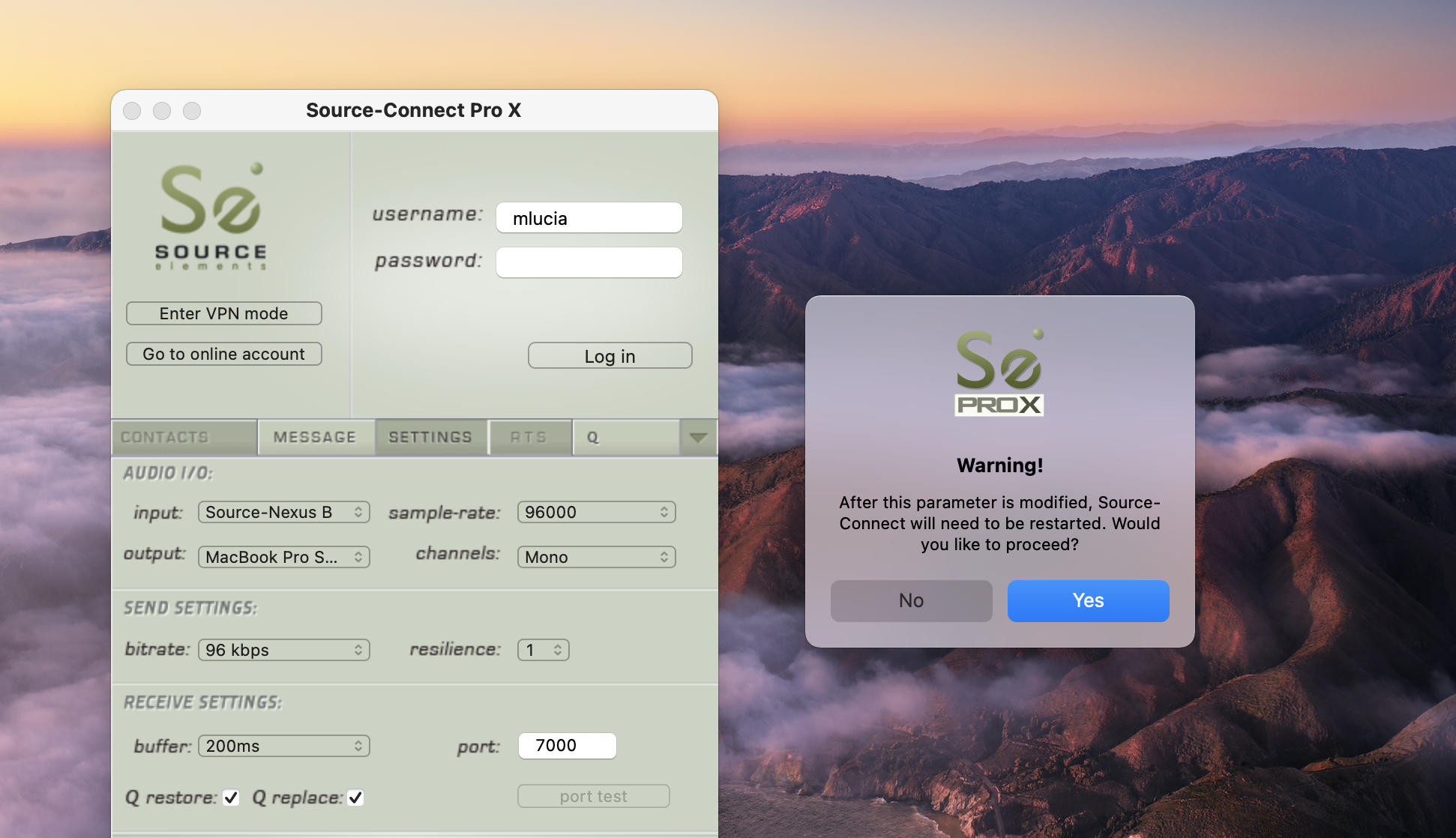 Después de modificar este parámetro, será necesario reiniciar Source-Connect . ¿Quieres continuar?