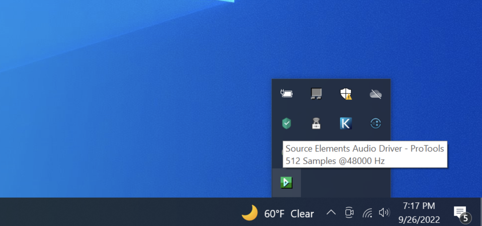 - En la barra de tareas de Windows, haga clic en la opción Controlador de audio Source Elements - Pro Tools .