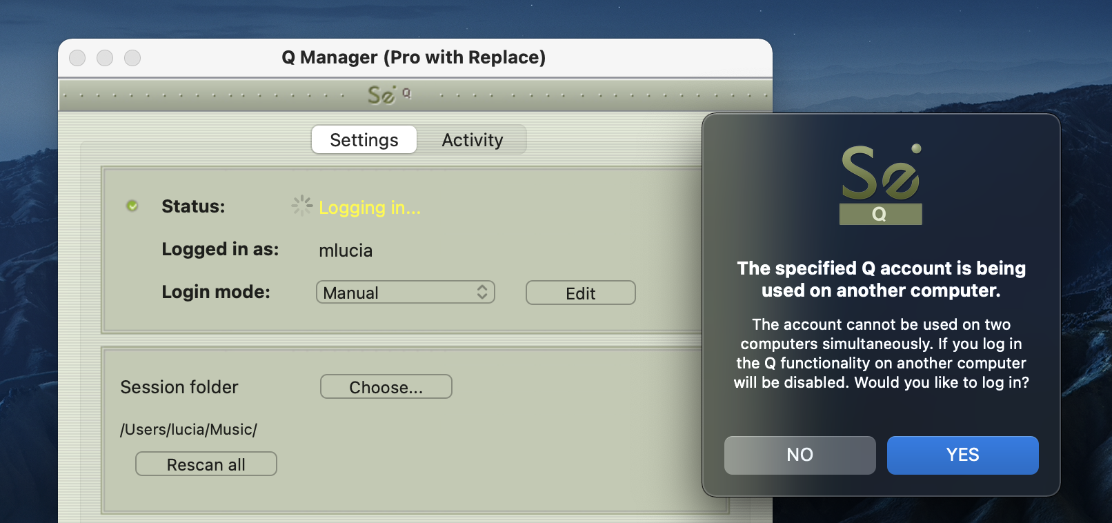 La cuenta no se puede utilizar en dos computadoras simultáneamente. Si inicia sesión, la funcionalidad Q en otra computadora se desactivará. ¿Quieres iniciar sesión?