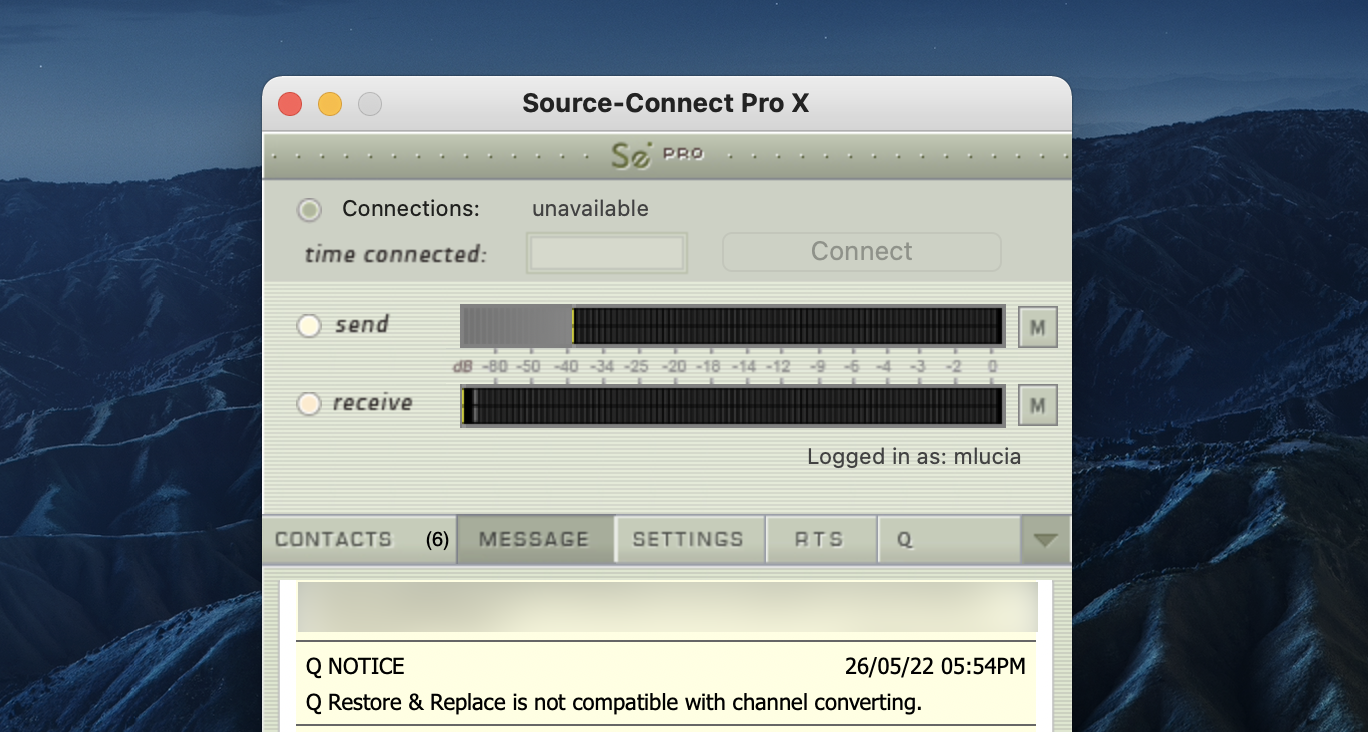 Usted y su socio de conexión están utilizando una cantidad diferente de canales (mono, estéreo, envolvente o de otro tipo). Source-Connect realizará una conversión entre canales mono y estéreo ( no entre canales mono/estéreo y envolventes), pero no convierte la cantidad de canales entre Source-Connect y su DAW .