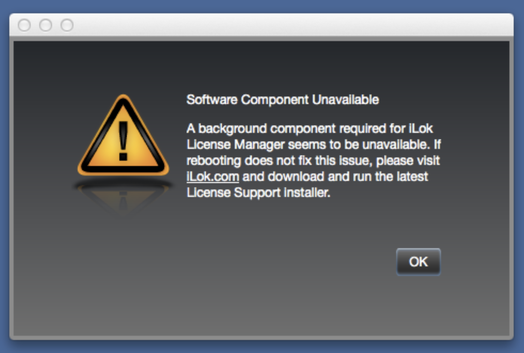 Cuando los usuarios intentan abrir cualquier aplicación de Source Elements que utilice iLok License Manager para administrar las licencias, reciben el siguiente mensaje de error:
