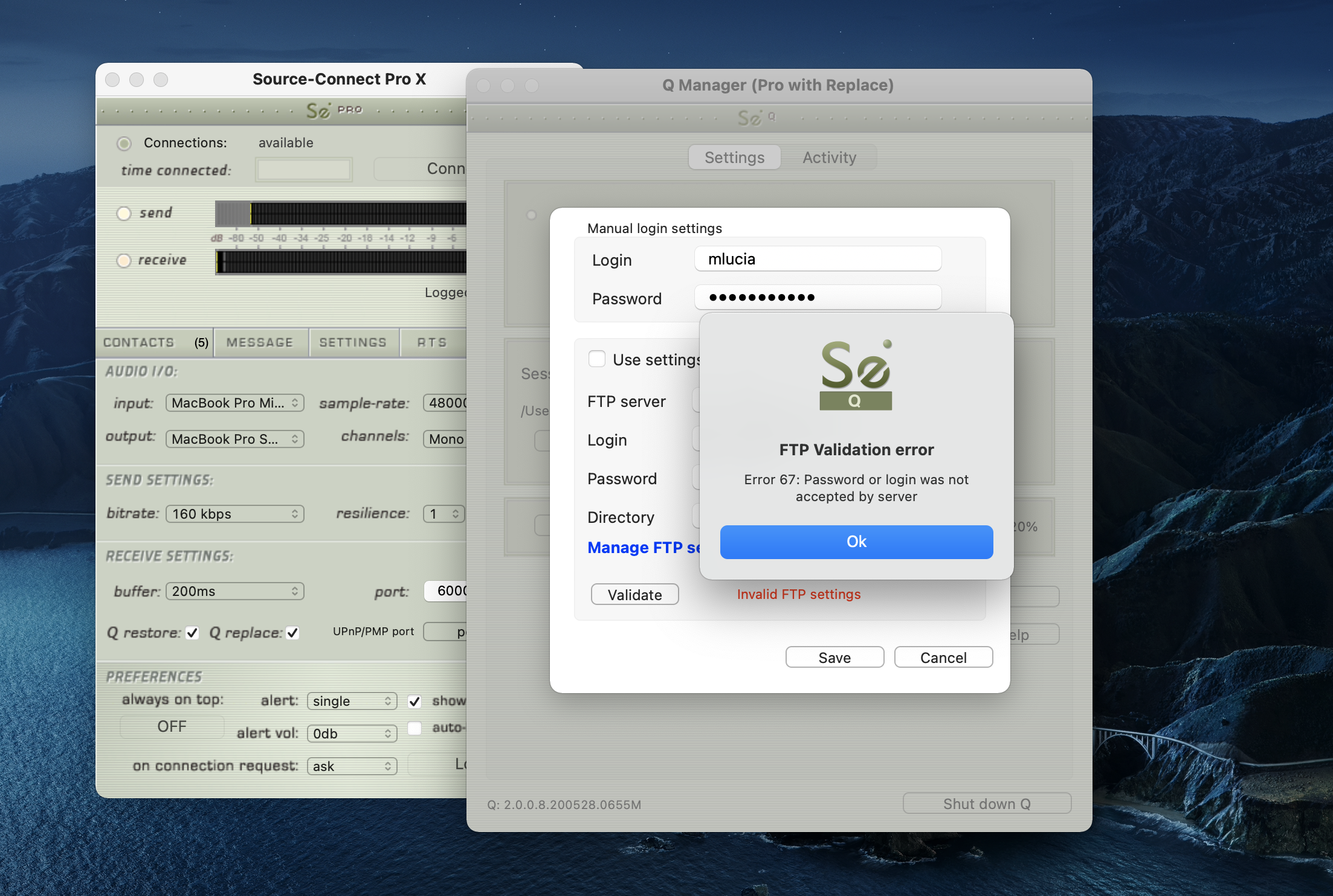 Source-Connect se inicia correctamente y solicita las credenciales del usuario. Después de escribir el nombre de usuario y la contraseña y hacer clic para iniciar sesión, se bloquea en la pantalla de inicio y luego falla.
