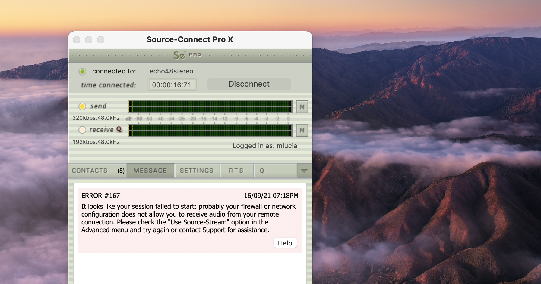 Cuando los usuarios intentan iniciar sesión en Source-Connect Pro , o están dentro de la aplicación, y cambian su red, reciben el siguiente mensaje de error y se cierra la sesión de la aplicación.