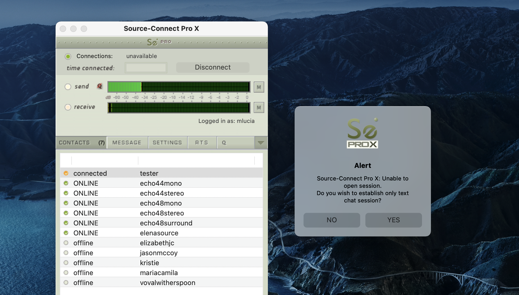 Source-Connect : No se puede abrir la sesión. ¿Desea establecer sólo una sesión de chat de texto?