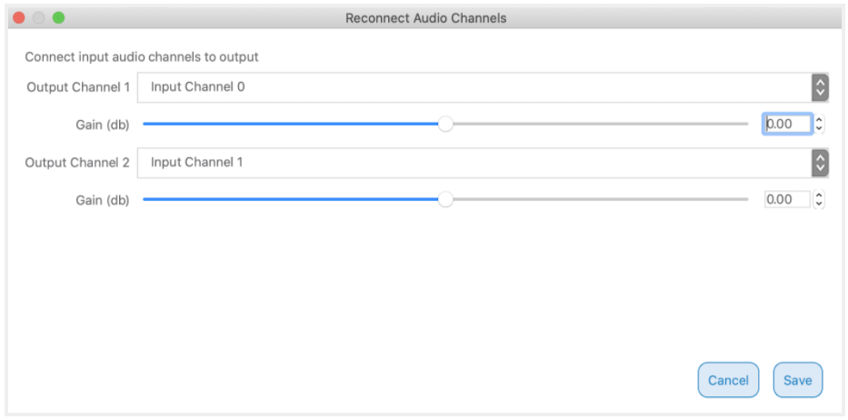 Haga clic en el ícono al lado de CANALES para conectar los canales de audio de entrada a los de salida si tiene más de uno.