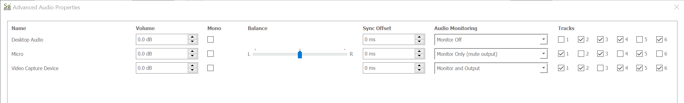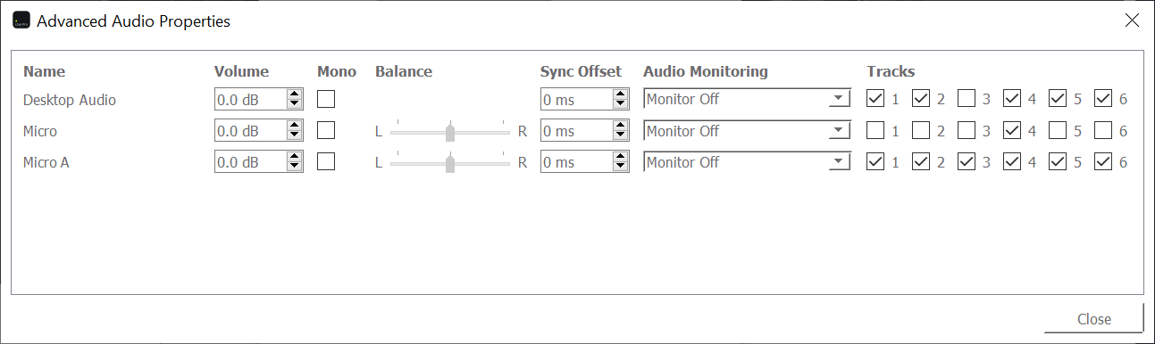 Todos los dispositivos de audio van a la pista 4; Esta pista, al mismo tiempo, también se puede utilizar para transmitir Source-Live . "Desktop Audio" y "Micro A" van en las pistas 1 y 2, sólo "Micro A" va en la pista 3, y así sucesivamente. Si la sesión se grabó en disco, es posible que el talento quiera repasar la pista 3 para buscar sus comentarios específicos; Por lo tanto, Source-Live le permite separar el audio del escritorio del audio del micrófono en caso de que desee revisar el contenido más tarde.