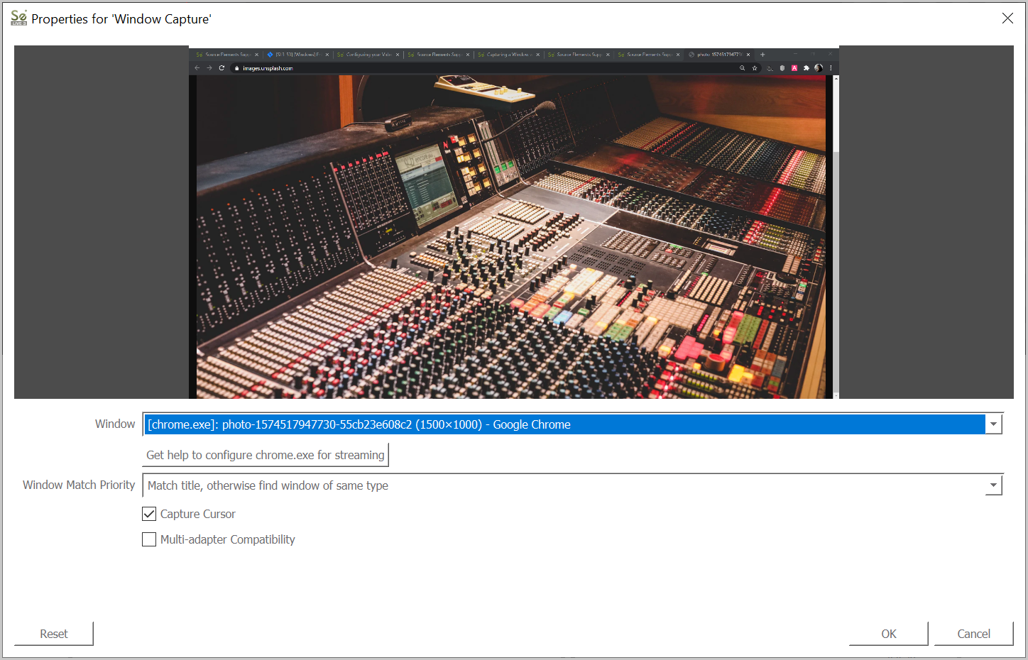 This article is part of the Source-Live User GuidePara capturar una ventana individual en su pantalla, o una imagen para dejarla como fondo estático para una transmisión de solo audio, seleccione "Capturar ventana".
