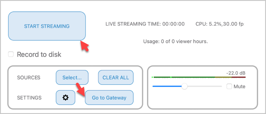 Una vez que esté listo para comenzar a transmitir, haga clic en el botón "INICIAR TRANSMISIÓN" en la aplicación Source-Live Pro LL . Luego, haga clic en "Ir al Gateway"