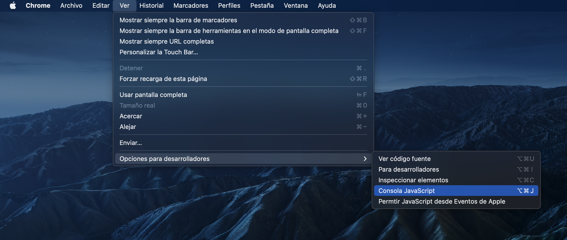 Puedes hacerlo yendo a Chrome > Ver > Desarrollador > Consola:
